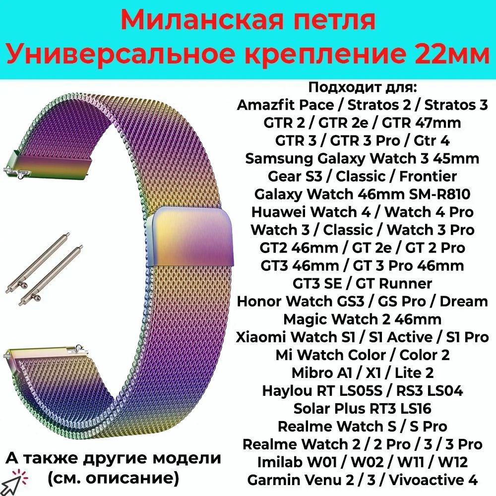 Миланский сетчатый металлический ремешок для умных смарт часов с шириной 22мм в месте крепления Быстросъёмные шпильки (штифты) - 2шт Индивидуальная упаковка