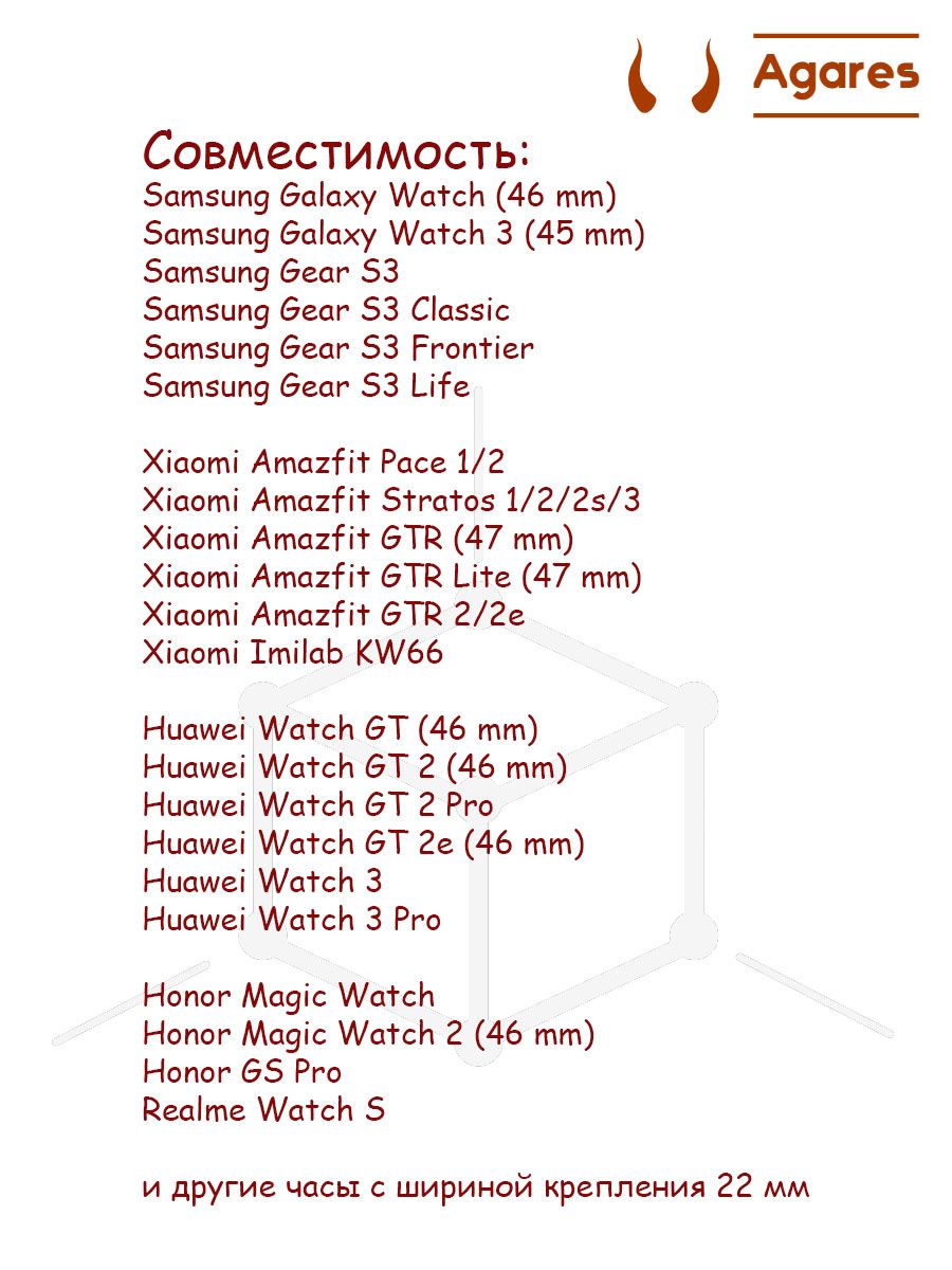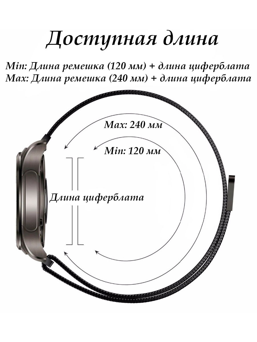 Описание: Ремешок для умных часов миланская петля выполнен из металла (нержавеющая сталь) и подходит под различные модели умных часов разных брендов. Ширина крепления 22 мм. Длина 255 мм. Материал позволяет ремешку долго оставаться в первозданном виде. Магнитная застежка на браслете позволит легко подогнать ремешок под запястье. Подойдет как мужчинам, так и женщинам. Если Вы сомневаетесь что ремешок подойдет к Вашей модели часов - измерьте ширину крепления вручную, она должна составлять 22 мм. Также обратите внимание - многие модели часов выпускаются в нескольких исполнениях - "побольше" и "поменьше" (на мужскую и женскую руку соответственно), и у этих исполнений зачастую разная ширина крепления. Данный ремешок подходит для следующих моделей: AMAZFIT: Amazfit Pace Amazfit Pace 2S Amazfit Stratos Amazfit Stratos 2 Amazfit Stratos 3 Amazfit GTR 47mm Amazfit GTR Lite 47mm Amazfit GTR 2 Amazfit GTR 2 Classsic Amazfit GTR 2 Sport Amazfit GTR 2 NEW (2022) Amazfit GTR 2E Amazfit GTR3 Amazfit GTR 3 Pro Amazfit GTR 4 Amazfit Zepp Z SAMSUNG: Samsung Gear S3 Samsung Gear S3 Classic Samsung Gear S3 Frontier Samsung Gear Life Samsung Galaxy Watch 46mm Samsung Galaxy Watch 3 45mm HUAWEI HONOR: Honor Watch GT 46mm Huawei Watch GT Runner Honor Watch GT 2 46mm Huawei Watch GT 2E Huawei Watch GT 2 Pro Huawei Watch GT 3 46mm Huawei Watch GT 3 Pro Huawei Watch GT 3 Pro Titanium Huawei Watch GT 3 SE Huawei Watch 3 Huawei Watch 3 Classic Huawei Watch 3 Pro Honor Magic Watch 2 46mm Honor Watch GS Pro Honor Watch Dream XIAOMI: Xiaomi Watch S1 Xiaomi Watch S1 Active Xiaomi Watch S1 Active GL Xiaomi Watch S1 Pro Xiaomi Mi Watch ( XMWTCL02 ) Xiaomi Mi Watch Color Xiaomi Mi Watch Color 2 Xiaomi Mi Watch Revolve Xiaomi Mi Watch Revolve Active Xiaomi Mi Watch Sport Xiaomi KIESLECT: Xiaomi Kieslect K10 Xiaomi Kieslect K11 Xiaomi Kieslect K11 Pro Xiaomi Kieslect KR Xiaomi Kieslect KR Pro Xiaomi Kieslect Lady Calling Watch LORA Xiaomi Kieslect Calling Watch KS Xiaomi MIBRO: Xiaomi Mibro A1 Xiaomi Mibro X1 Xiaomi Mibro Lite 2 Xiaomi Mibro GS Xiaomi IMILAB: Xiaomi Imilab KW66 Xiaomi Imilab W11 Xiaomi Imilab W12 HAYLOU: Haylou RT LS05S Haylou RS3 LS04 Haylou Solar GS LS09A Haylou GST LS09B Haylou Solar RT2 LS10 Haylou LS13 GST Lite Haylou RT3 LS16 Haylou LS01 GARMIN: Garmin Vivoactive 4 Garmin Vivoactive 4S Garmin Venu 2 Garmin Forerunner 955 Garmin Forerunner 955 Solar REALME: Realme Watch S Realme Watch S Pro Realme Watch 2 Realme Watch 2 Pro Realme Watch 3 Realme Watch 3 Pro LG: LG G Watch LG G Watch R LG Watch Urbane LG Watch W7 LENOVO: Lenovo S2 Lenovo S2 Pro MAIMO: Maimo Watch WT2105 COROS: Coros Pace 2 AIMOTO: Aimoto Voyager R2 POLAR: Polar Vantage M Polar Vantage M2 Polar Vantage V2 Shift Polar Grit X Polar Grit X Pro DIESEL: Diesel Full Guard 2.5 ASUS: Asus VivoWatch 5 Asus ZenWatch 2 Asus VivoWatch SP TICWATCH: Mobvoi TicWatch E2 Mobvoi TicWatch Pro Mobvoi TicWatch E3 Mobvoi TicWatch Pro 3 Mobvoi TicWatch Pro 3 Ultra FOSSIL: Fossil Gen 3 Smartwatch Q Explorist Fossil Q Explorist HR Gen 4 Fossil Gen 5 Julianna HR Fossil Gen 5 Carlyle HR Fossil Gen 6 44mm SKAGEN: Skagen Falster 3 SMARTERRA: Smarterra SmartLife Atlas Smarterra SmartLife Thor SUUNTO: Suunto 9 Peak Suunto 9 Peak Pro KREZ: Krez Blast Krez Pro Krez Pro S ZEBLAZE: ZeBlaze Stratos ZeBlaze Stratos 2 ZeBlaze GTR 2 LEMFO: Lemfo LF26 Lemfo LF26 Lemfo LF26 Pro Lemfo LF28 KingWear LW09 Tiroki S11 Smart Watch GT 3 Max и других часов с шириной крепления 22 мм.
