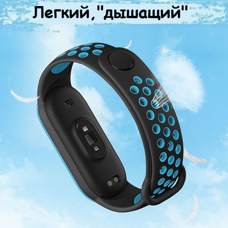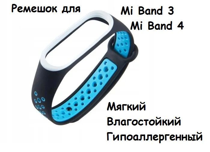Ремешок для фитнес - браслета для умных часов Xiaomi Mi Band 3 и Mi Band 4 Силиконовый Перфорированный , черно-голубой.