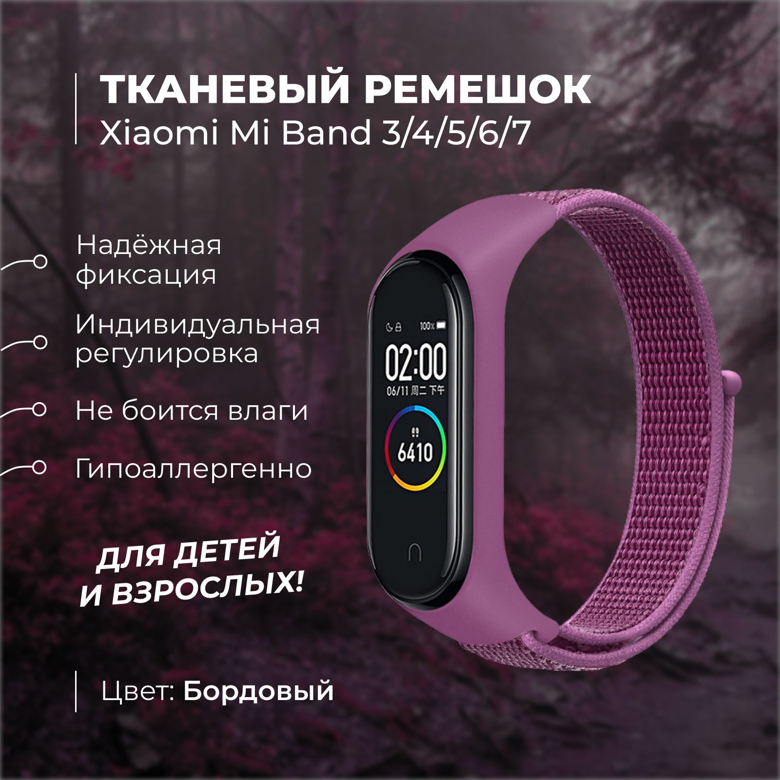 Ремешок для фитнес-браслета Xiaomi Mi Band 3/4/5/6/7. Бордовый. Тканевый нейлоновый спортивный браслет для умных (смарт) часов, сменный браслет на липучке мужской и женский.