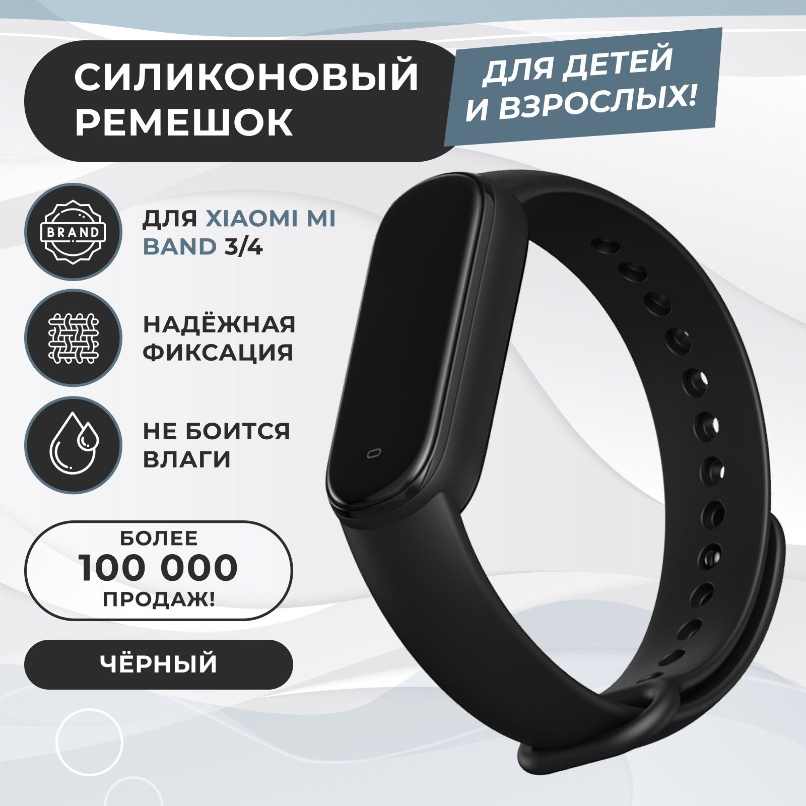 Ремешок для фитнес-браслета Xiaomi Mi Band 3/4, чёрный. Силиконовый, спортивный браслет для умных (смарт) часов Сяоми Ми Бэнд 3/4, сменный браслет мужской и женский.