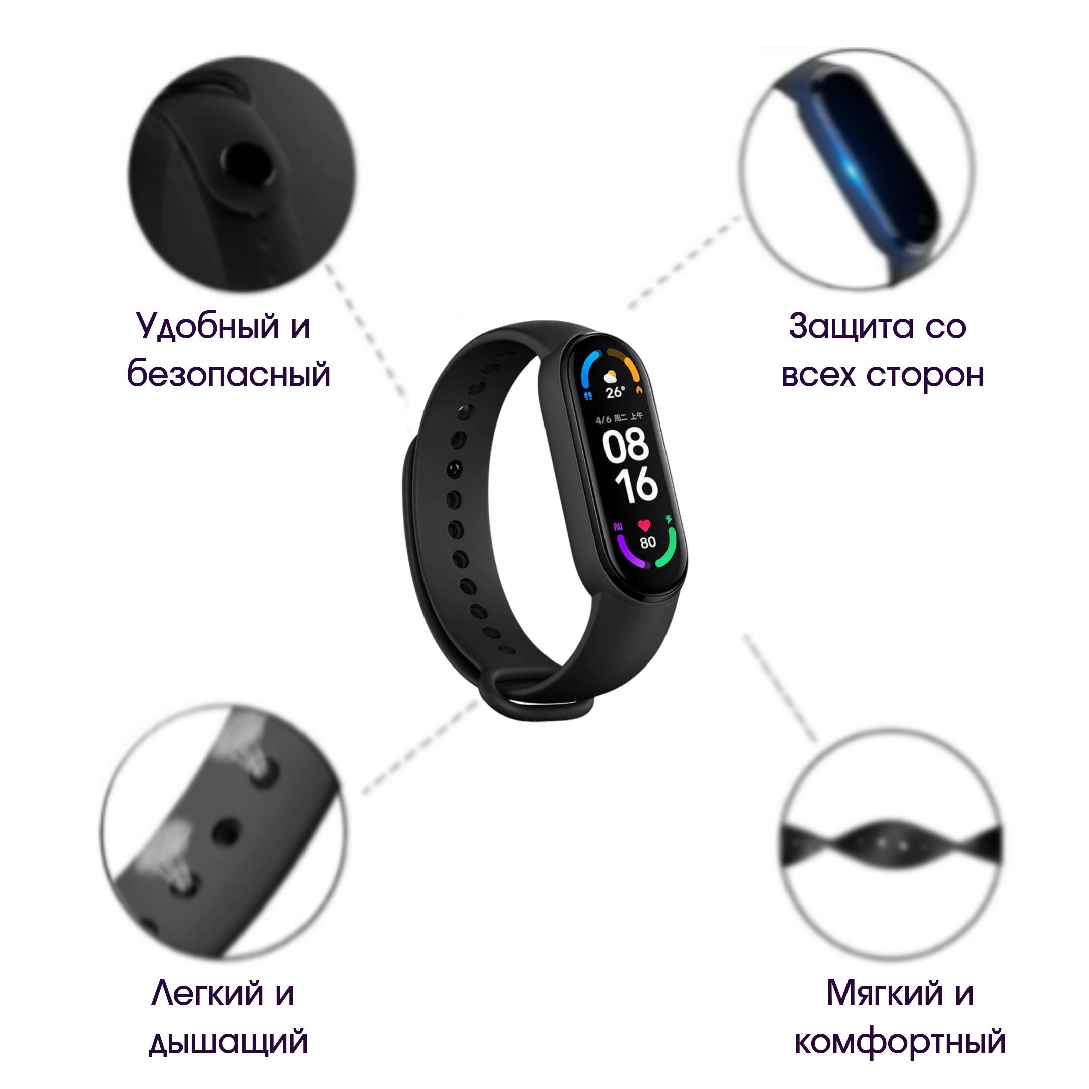 Ремешок для смарт часов Mi Bend можно использовать в воде, в повседневной жизни и для занятий спортом. Мягкий и надежный силиконовый ремешок будет служить вам долго за счет прочного гипоаллергенного материала.