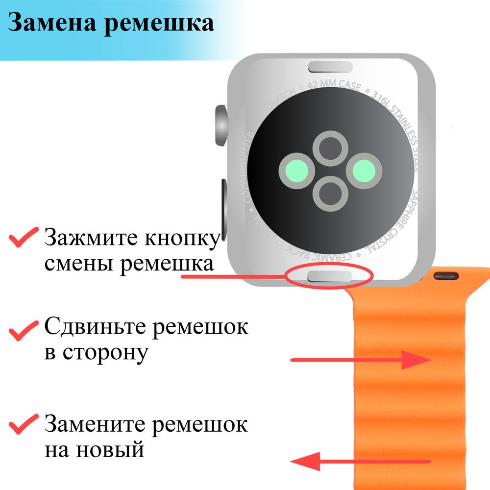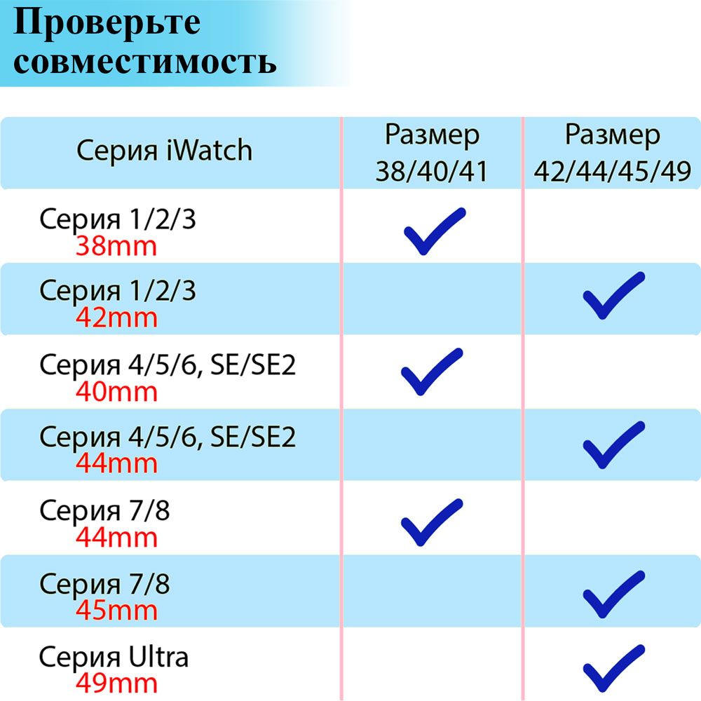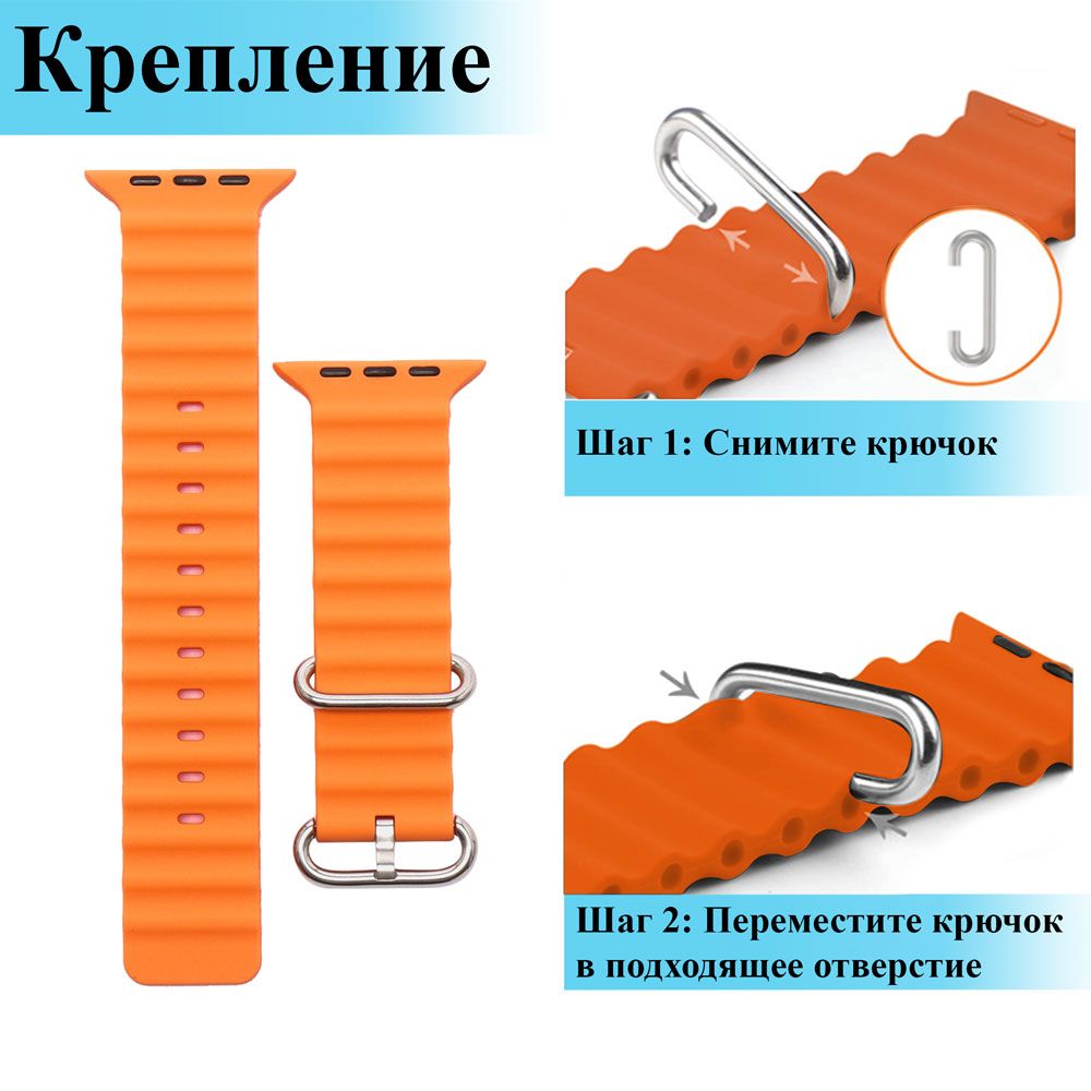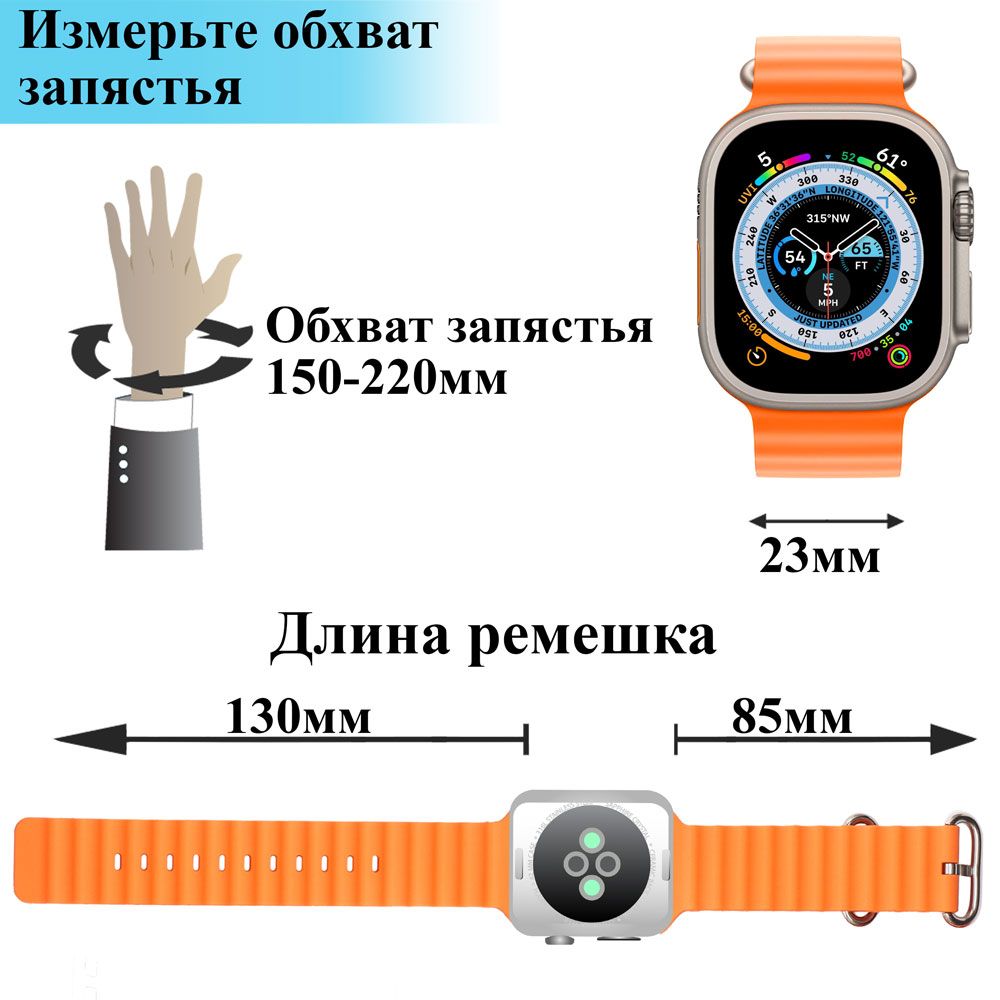 Описание: Материал ремешка – это премиальный высококачественный нескользящий силикон. Материал долго служит, сохраняет форму и гибкость, не подвержен воздействию влаги, комфортно сидит на запястье, не вызывает аллергических реакций. Ремешок подойдет под любую серию Apple Watch размером 42 мм/ 44 мм/ 45 мм/ 49 мм. Длина браслета легко регулируется при помощи передвижной металлической застежки, которая надежно фиксирует ремешок и не натирает кожу. Ширина ремешка составляет 23 мм. Подходит для рук с обхватом запястья 150-215 мм.