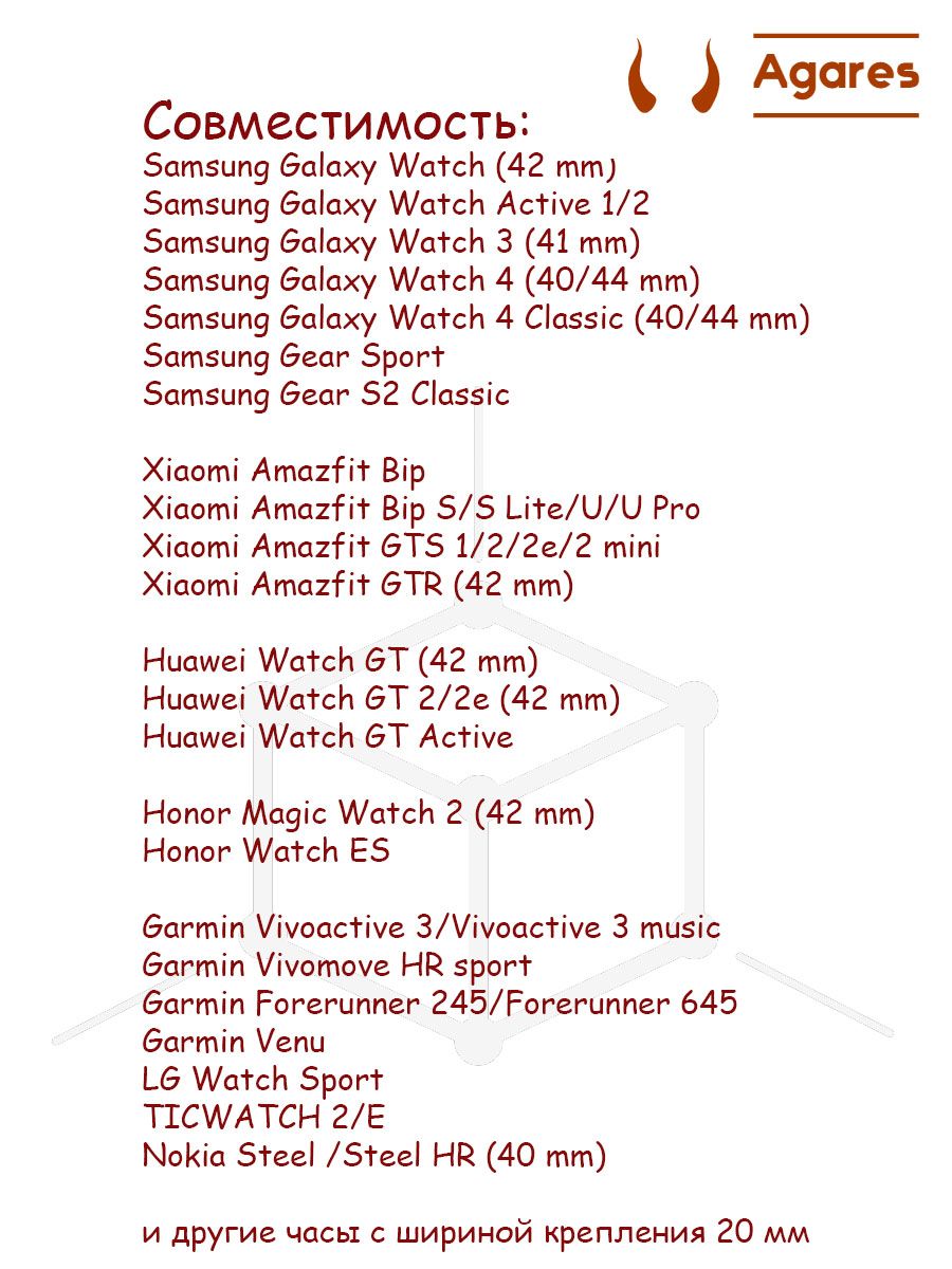 Описание: Ремешок для умных часов миланская петля выполнен из металла (нержавеющая сталь) и подходит под различные модели умных часов разных брендов. Ширина крепления 20 мм. Длина 230 мм. Материал позволяет ремешку долго оставаться в первозданном виде. Магнитная застежка на браслете позволит легко подогнать ремешок под запястье. Подойдет как мужчинам, так и женщинам. Если Вы сомневаетесь что ремешок подойдет к Вашей модели часов - измерьте ширину крепления вручную, она должна составлять 20 мм. Также обратите внимание - многие модели часов выпускаются в нескольких исполнениях - "побольше" и "поменьше" (на мужскую и женскую руку соответственно), и у этих исполнений зачастую разная ширина крепления. Идеально подойдет для следующих моделей: SAMSUNG: Samsung Galaxy Watch 3 41mm Samsung Gear Sport Samsung Gear S2 Samsung Gear S2 Classic Samsung Galaxy Watch Active Samsung Galaxy Watch Active2 40mm Samsung Galaxy Watch Active2 44mm Samsung Galaxy Watch 42mm AMAZFIT: Amazfit GTS Amazfit GTS 2 Amazfit GTS 2e Amazfit GTS 2 Mini Amazfit GTS 3 Amazfit GTS 4 Amazfit GTS 4 Mini Amazfit GTR 42mm Amazfit GTR Lite 42mm Amazfit Bip Amazfit Bip Lite Amazfit Bip S Amazfit Bip S Lite Amazfit Bip U Amazfit Bip U Pro Amazfit Bip 3 Amazfit Bip 3 Pro Amazfit Bip U Pop Amazfit Bip U Pop Pro Amazfit Zepp E Circle Amazfit Zepp E Square HUAWEI HONOR: Huawei Watch 2 Huawei Watch 2 Classic Huawei Watch GT 2 42mm Huawei Watch GT 3 42mm Huawei Watch GT 3 Pro Ceramic 43mm Honor Watch ES Honor Magic Watch 2 42mm HAYLOU: Haylou LS02 Haylou LS11 RS4 Plus Haylou LS12 RS4 Mibro: Mibro T1 Mibro Air Mibro Lite Mibro C2 KIESLECT: Kieslect L11 Kieslect L11 Pro GARMIN: Garmin Forerunner 245 Garmin Forerunner 245 Music Garmin Forerunner 645 Garmin Forerunner 645 Music Garmin Venu Garmin Venu SQ Garmin Vivoactive 3 Garmin Vivoactive 3 Music Garmin VivoMove 3 Garmin Vivomove HR Garmin Vivomove Luxe Garmin Vivomove Style REALME: Realme Watch Realme Dizo Watch 2 Realme Techlife Watch S100 Realme Watch T1 MOBVOI TICWATCH: TicWatch E TicWatch 2 TicWatch C2 TicWatch GTH POLAR: Polar Ignite Polar Ignite 2 Polar Ignite 3 Polar Unite KREZ: Krez Roze 2 SW15 Krez Blaze SW27 Krez Bluez SW19 Krez Swift SW20 Krez Conga SW21 Krez Jazz SW14 COLMI: Colmi P8 Colmi P8 Pro Colmi P8 Plus Colmi P9 Colmi P28 Plus Colmi V11 LENOVO: Lenovo Watch 9 Lenovo Watch X Plus Lenovo E1 Pro NOERDEN: Noerden Life 2 Noerden Life 2 Plus Noerden Mate 2 Noerden Mate 2 Plus OnePlus Watch Nokia Steel HR 40mm Maimo Watch R ZTE Watch Live Skagen Falster Skagen Falster 2 Dexp A1 / R2 / K1 / K2 / K3 / K4 / K5 / SB60 / Watch Fit SW86 Digma Smartline D1 / D5 / H3 / H4 Ritmix RFB-450 Ritmix RFB-510 WatchMe P28 Plus WatchMe H36 WatchMe i70 SUUNTO 3 Fitness Emporio Armani Connected Matteo 44mm Smart Watch 3 Pro Series 46mm Smart Watch X5 Pro Smart Watch W&O X6 Pro Izzi Time D20S Lemfo Lem 10 Welbe Prime Welbe Slim 42mm ZeBlaze Hybrid ZeBlze BTalk Lite Kospet Tank M1 Pro HealthBand Health Watch Pro №5 HEALTHBAND Health Watch Pro №80 HEALTHBAND Health Watch Pro №80M Также подойдет для любых наручных кварцевых и механических часов со стандартным креплением шириной 20 миллиметров.