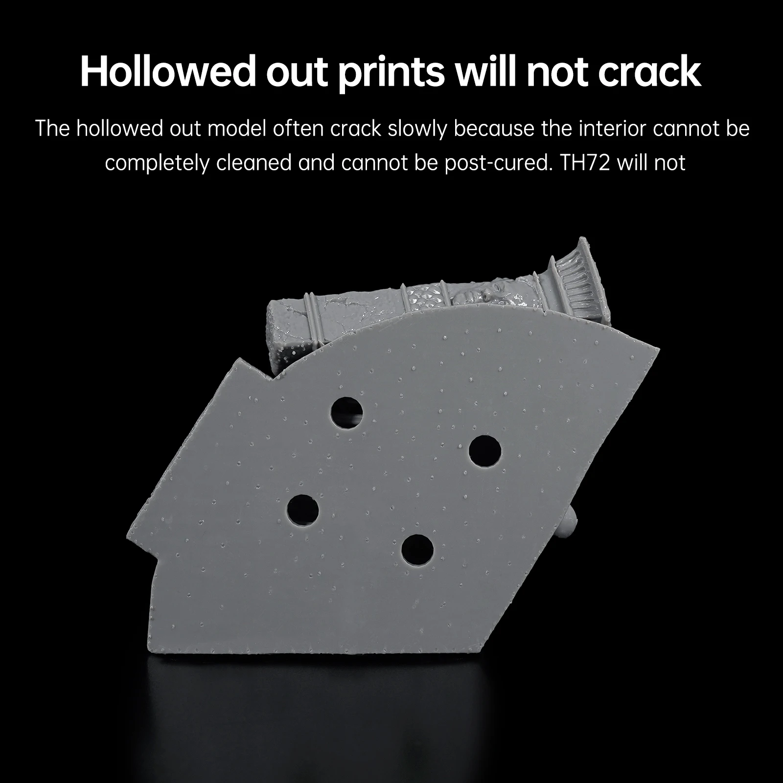 Выдолбленная модель часто медленно трескается, потому что внутренняя часть не может быть полностью очищена и не может быть отверждена после. TH72 не будет, что позволит сэкономить больше материала.