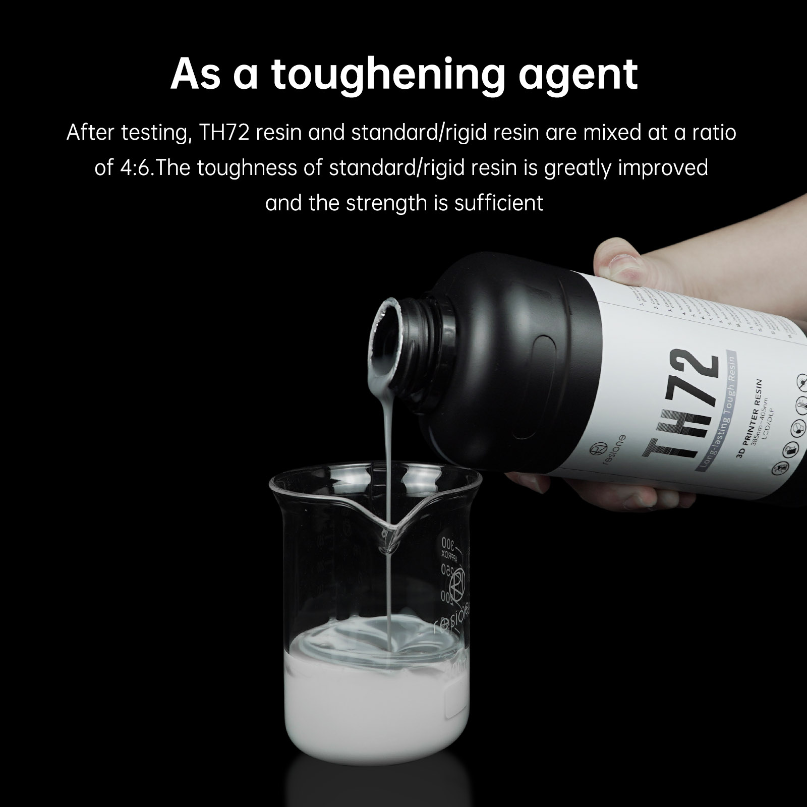 Команда RESIONE проверила, что TH72 был добавлен к жесткой/стандартной смоле. Когда доля TH72 в смешанной смоле составляет 40%, прочность жесткой/стандартной смолы значительно улучшается и прочность достаточна.