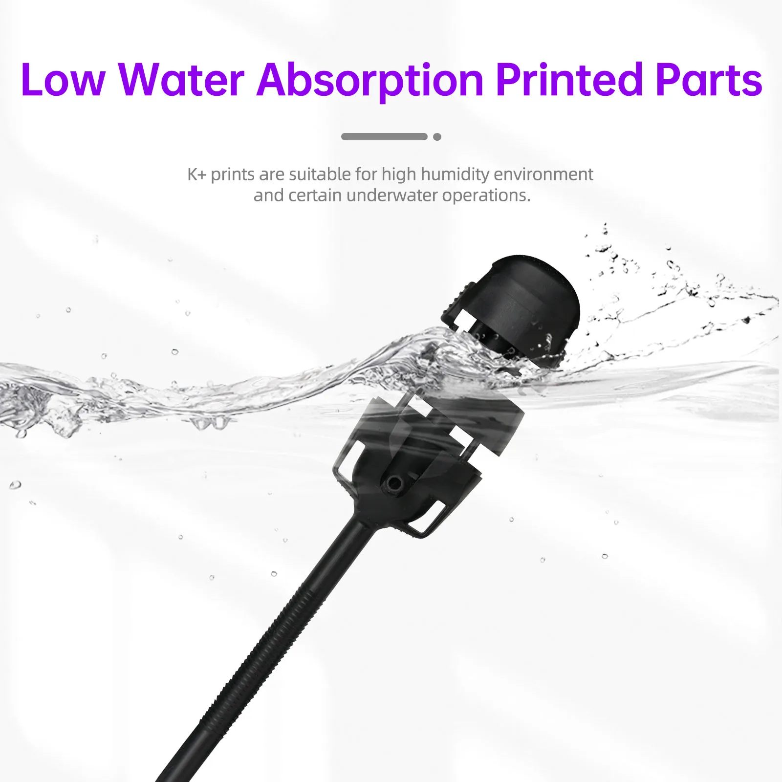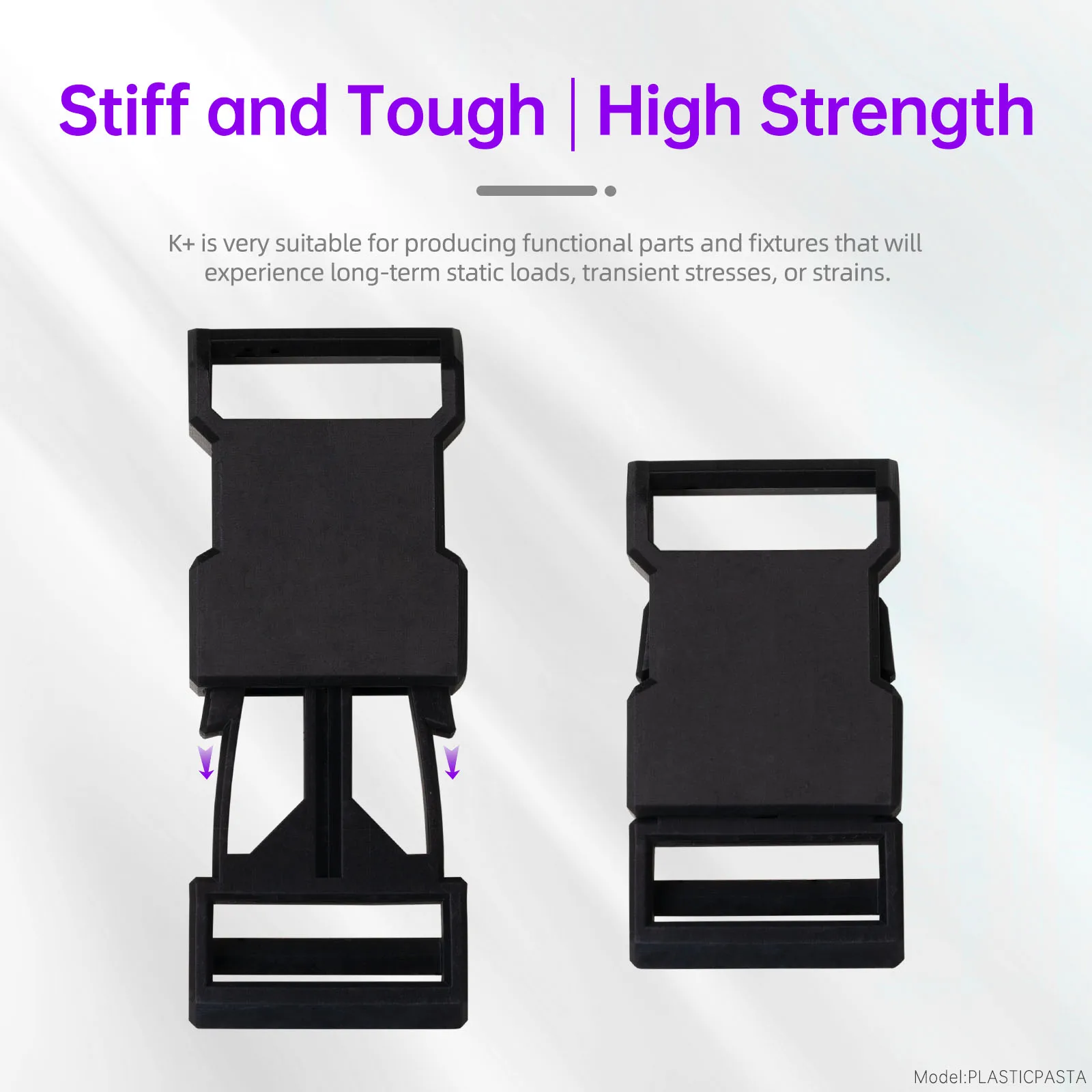 K + претерпел обновление формулы на основе K смолы, что делает его идеальным материалом для производства функциональных деталей или сборок. K + и K печатные детали имеют схожие физические свойства-высокую жесткость и прочность, чрезвычайно высокую точность размеров и деталей. Однако K + имеет более низкое водопоглощение и лучшую устойчивость к царапинам по сравнению с K, что делает K + более широко используемым, например, для деталей, работающих в условиях высокой влажности, или компонентов, требующих многократной разборки и сборки. Кроме того, детали, напечатанные K +, чисто черные и не будут выглядеть синим фиолетовым на солнце, с текстурой и механическими свойствами, аналогичными таковым у деталей, изготовленных методом литья под давлением.