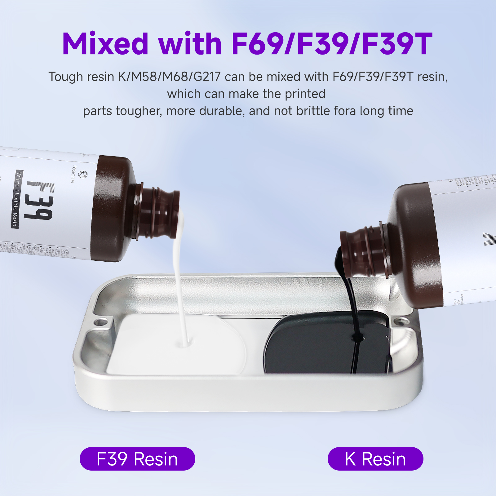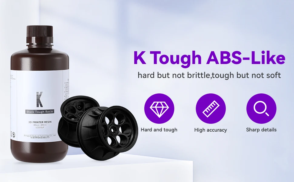 Поверхность печатных деталей K + твердая, с отличными характеристиками устойчивости к царапинам. Поверхность деталей не будет легко Царапаться твердыми предметами или порошкообразным трением. Если вам нужно напечатать детали, требующие повторной сборки или Защелкивающейся посадки, эта смола-хороший выбор.
