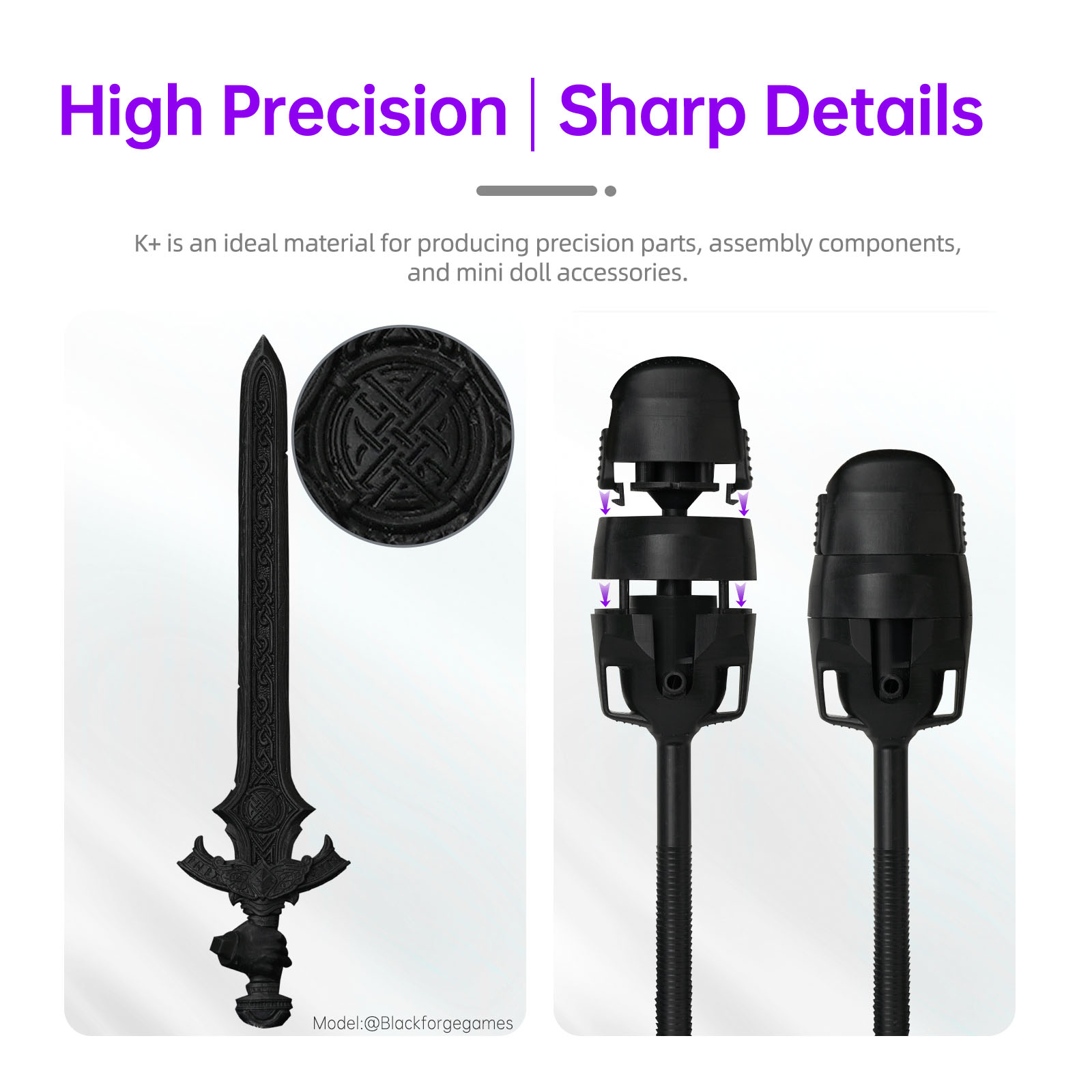 Специальная композиция смолы K + делает ее менее подверженной передержке и позволяет напечатанным частям точно воспроизводить чрезвычайно мелкие детали 3D-данных, такие как канавки, текстуры, волоски, отверстия и выступы. Детали могут быть изготовлены с точной сборкой, что делает их идеальным материалом для изготовления прецизионных деталей, сборочных компонентов и аксессуаров для мини-кукол.