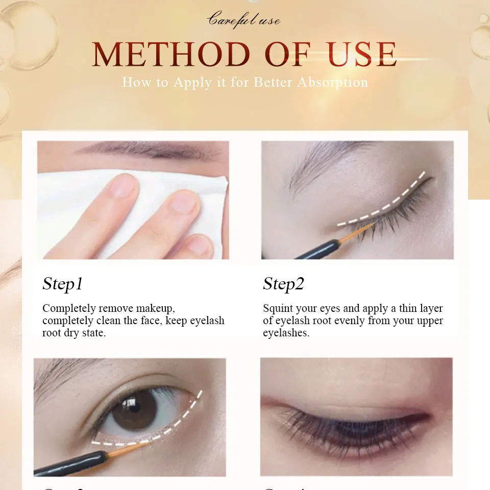 Намажьте на корень ресниц, лучше всего намазать небольшое количество много раз, после трения в течение 30 секунд, прежде чем мигать. Если вы случайно прикоснетесь к коже снаружи корня ресниц при размазывании, вы можете вытереть ее ватной палочкой и чистой водой.