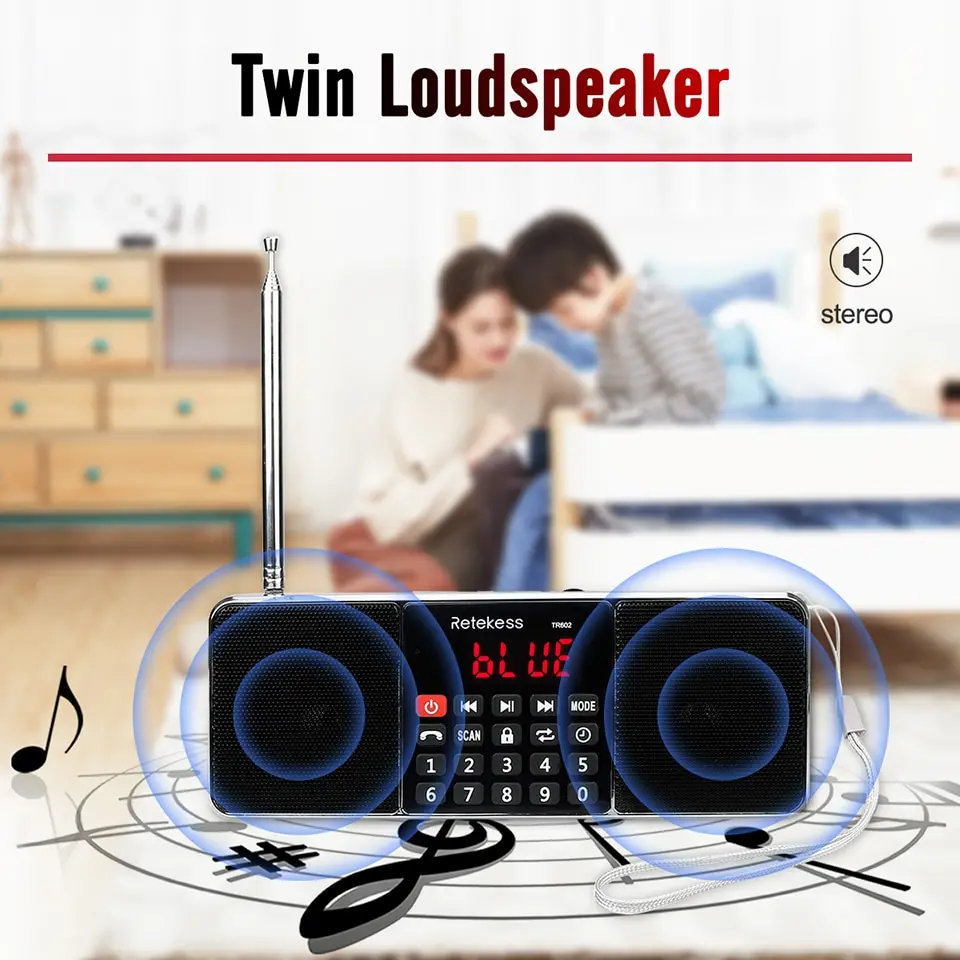 RETEKESS TR602 Digital Portable Radio AM FM Bluetooth Speaker Stereo MP3 Player TF SD Card USB Drive Handsfree Call LED