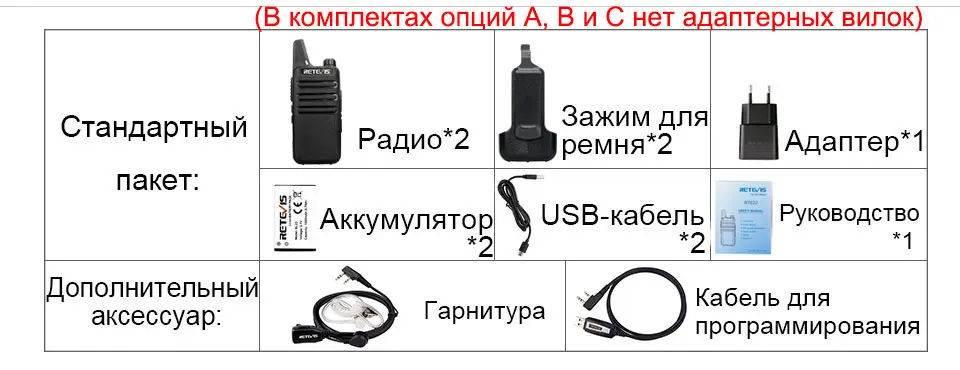 1. Стандартный пакет не включает наушники и кабель для программирования.