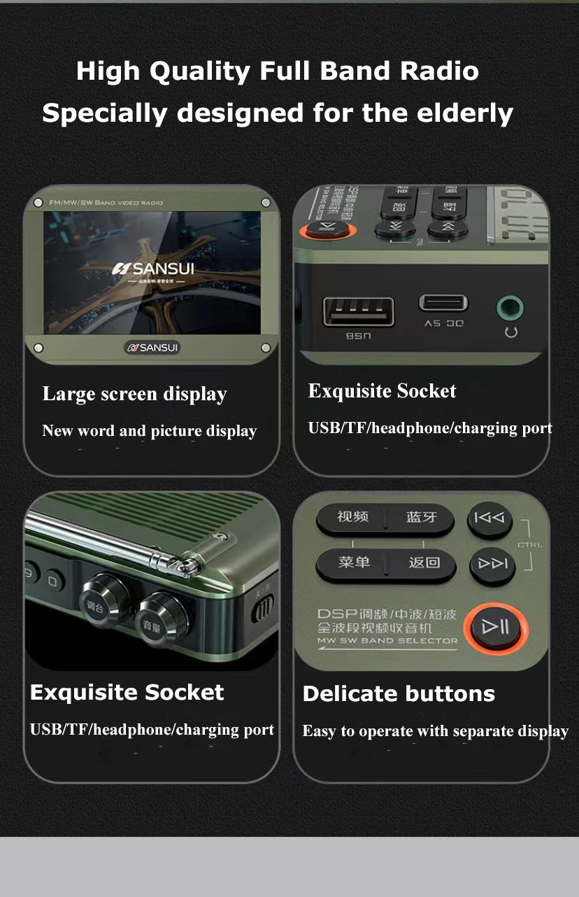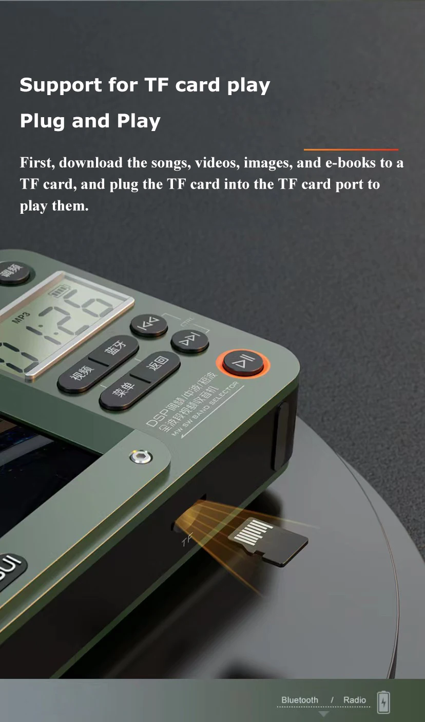 Основные функции: BT/TF/USB/FM/цифровая песня по запросу/воспроизведение музыки без потерь/видео/FM/средняя волна/Коротковолновая волна/меню/