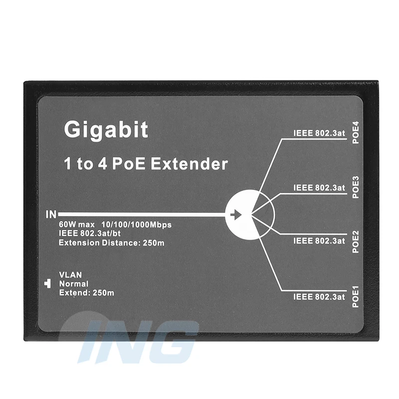 Revotech Gigabit 4 порта 60 Вт PoE удлинитель, 1000 Мбит/с 1 в 4 out PoE + ретранслятор с 3 режимами в наличии
