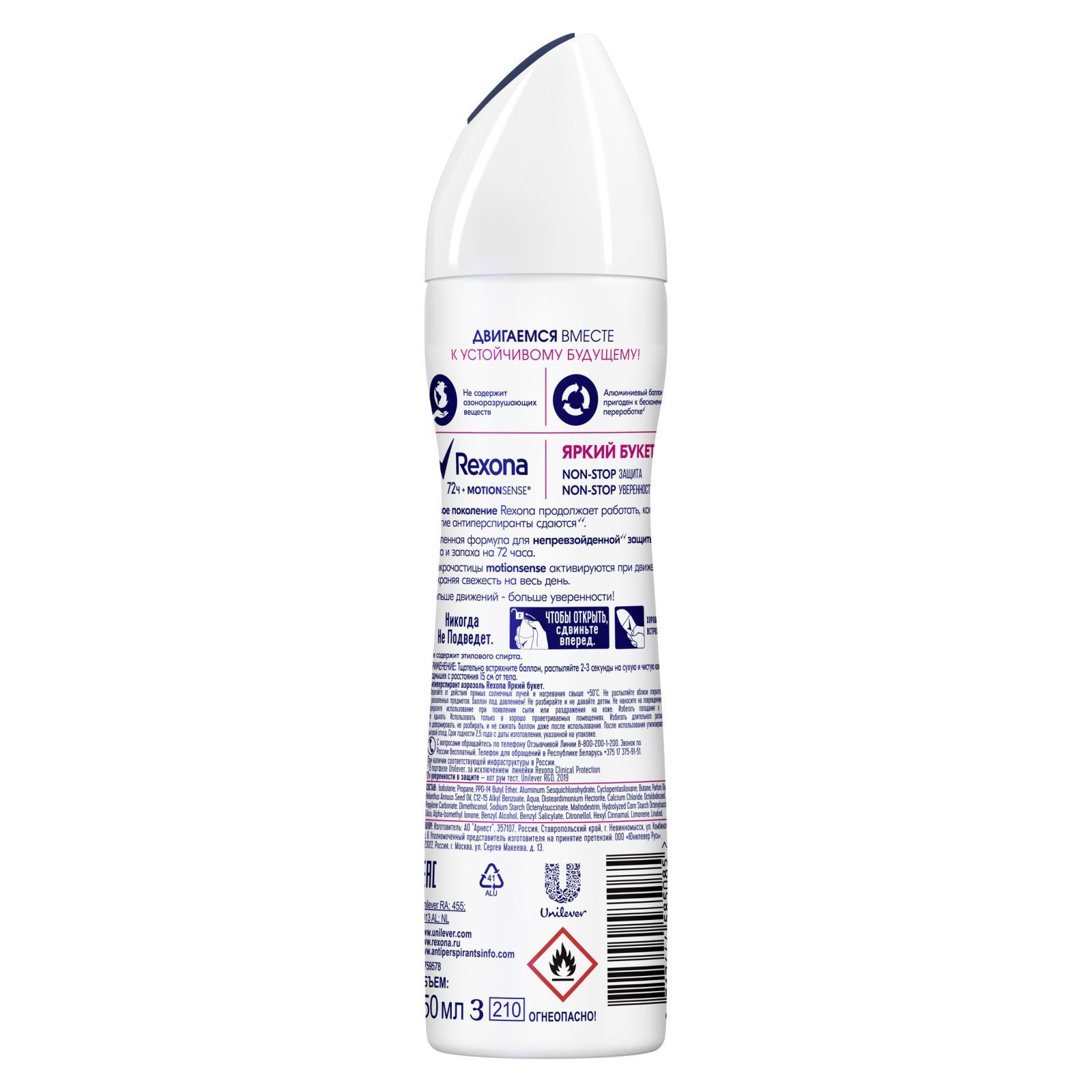 Описание: Наслаждайтесь каждым днем, каким бы насыщенным и непредсказуемым от ни был. Защиту от пота и неприятного запаха берет на себя Rexona. Антиперспирант-аэрозоль Яркий букет разработан на основе революционной технологии Motionsense, которая активируется при движении, сохраняя свежесть и абсолютный** комфорт на весь день. Микрочастицы состава образуют дышащую микропленку для надежной защиты от пота и запаха. Потовые железы блокируются частично, кожа при этом дышит. Защита от пота и запаха до 72 часов гарантирована. Чем больше вы двигаетесь – тем больше работает антиперспирант! Неважно, насколько интенсивный график у вашего дня: дедлайны, собрания, прогулки с ребенком – будьте уверенными в защите от Rexona. Не требует повторного нанесения в течение дня. Антиперспирант отлично впитывается, не оставляя следов и ощущения липкости. Весь день вы ощущаете только свежесть и роскошный, сложный аромат сочной клубники и абрикоса с утонченными нотками нежной магнолии, чувственного жасмина и ландыша с теплыми аккордами ванили, мускуса и кедра.В линейке серии также представлен шариковый антиперспирант, чтобы вы могли выбрать идеальный для себя формат. Добавьте Rexona в свой ежедневный ритуал свежести. Используйте антиперспирант сразу после приема душа, наслаждайтесь свежестью весь день и будьте уверены. Дерматологически протестировано. Двигаемся к устойчивому будущему вместе с Rexona! Еще больше информации вы найдете на сайте бренда rexona.com/ru/ *хот рум тест, Unilever R&D, 2019. **в портфеле Unilever, за исключением линейки Rexona Clinical Protection.