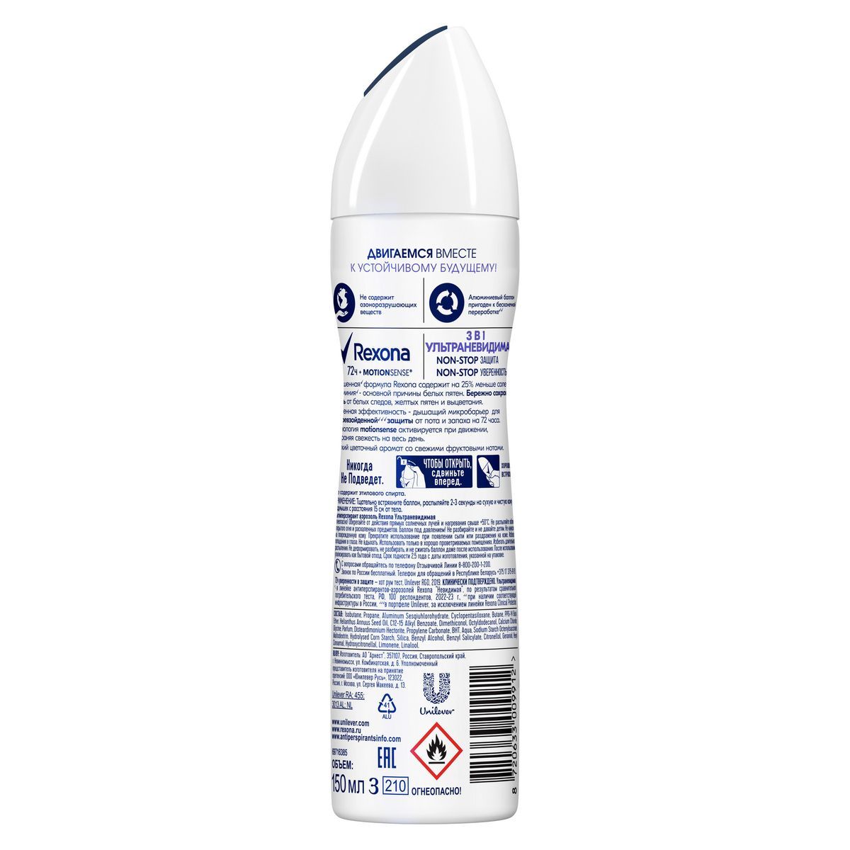 Описание: Ощущайте комфорт и уверенность вместе с антиперспирантом-аэрозолью Rexona Ультраневидимая. Усиленная эффективность – дышащий микробарьер для непревзойденной** защиты от пота и запаха на 72 часа. Формула антиперспиранта создана с использованием инновационной технологии Motionsense**. Микрокапсулы которой, распыленные на поверхность кожи, раскрываются во время движения под действием трения, непрерывно высвобождая дополнительный аромат. Улучшенная^ формула Rexona содержит на 25% меньше солей алюминия^ – основной причины белых пятен. Бережно сохраняет ткань от белых следов, желтых пятен и выцветания. Живите в своем темпе, выбирайте модные образы и одевайтесь под настроение, защиту от пота и запаха возьмет на себя Rexona. Антиперспирант имеет комплиментарный цветочный аромат с нотками фруктов. Садится близко к коже и не перебивает аромат вашего парфюма. Формат аэрозоля удобен в использовании и быстро высыхает после нанесения. В линейке серии также представлены шариковый антиперспирант и антиперспирант-карандаш, чтобы вы могли выбрать идеальный для себя формат. Продукт представлен в новом стильном дизайне, который займет достойное место на вашей полочке. Не содержит этилового спирта. Дерматологически протестирован. Двигаемся к устойчивому будущему вместе с Rexona! Продукт не содержит озоноразрушающих веществ. Алюминиевый баллон пригоден к бесконечной переработке***. Еще больше информации вы найдете на сайте бренда rexona.com/ru/ *хот рум тест, Unilever R&D, 2019, клинически подтверждено. **в портфеле Unilever, за исключением линейки Rexona Clinical Protection. ***При наличии соответствующей инфраструктуры в России. Ультраневидимая, ^ - в линейке антиперспирантов-аэрозолей Rexona Невидимая.