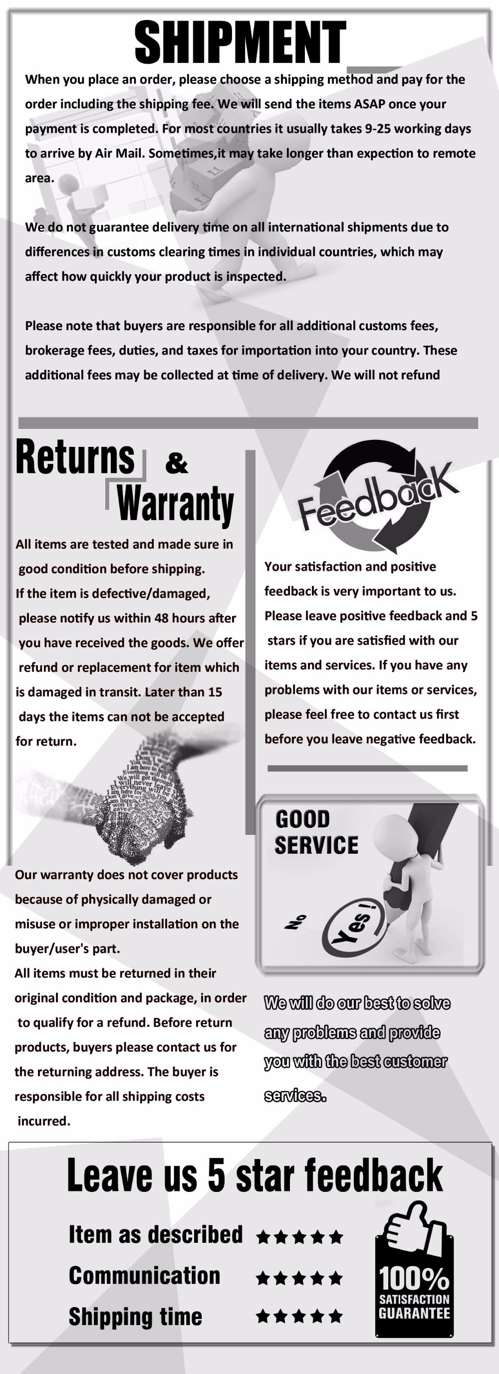Мы поддерживаем высокие стандарты качества и стремимся к 100% удовлетворенности клиентов! Если вы удовлетворены нашими продуктами и услугами, пожалуйста, оставьте нам 5★★★★★Отзывы звезд. Ваш положительный отзыв очень важен для нас.