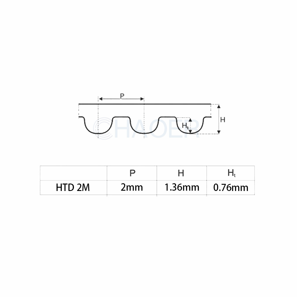 HTD 2MШаг зуба: форма зуба системы HTD представляет собой дугу окружности, а шаг зуба HTD 2 M составляет 2 мм. Обычно он подходит для передачи с высокой мощностью и высоким крутящим моментом. Его мощность передачи в 3-5 раз больше, чем у трапециевидного зубчатого шкива, а скорость обычно средняя и низкая.