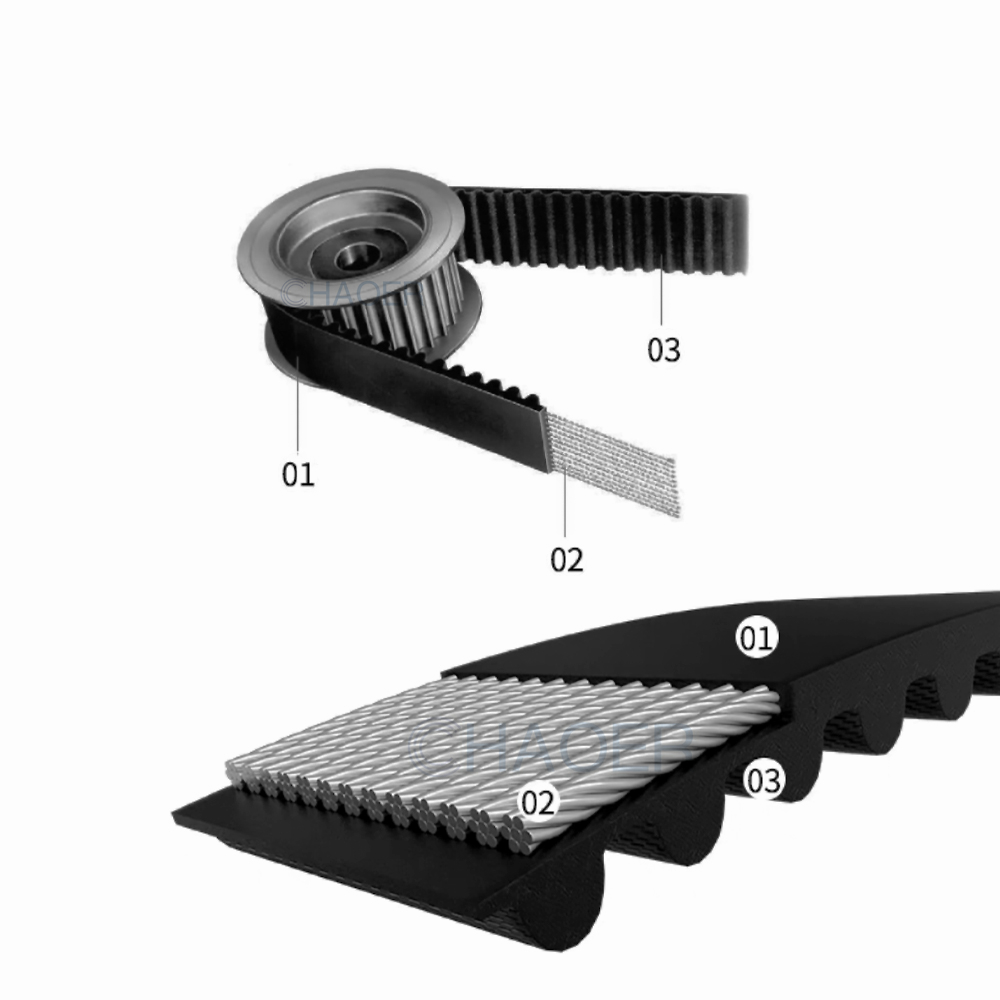 01: Ремень изготовлен из неопрена, который более устойчив к скачкам и истиранию зубов, а также обладает хорошей маслостойкостью, термостойкостью и устойчивостью к старению.