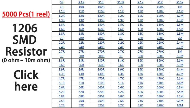 1206 резистор 1/4 Вт (0 Ом ~ 10 м Ом) 300 шт./лот нажмите здесь 1 катушка (5000 шт) нажмите здесь