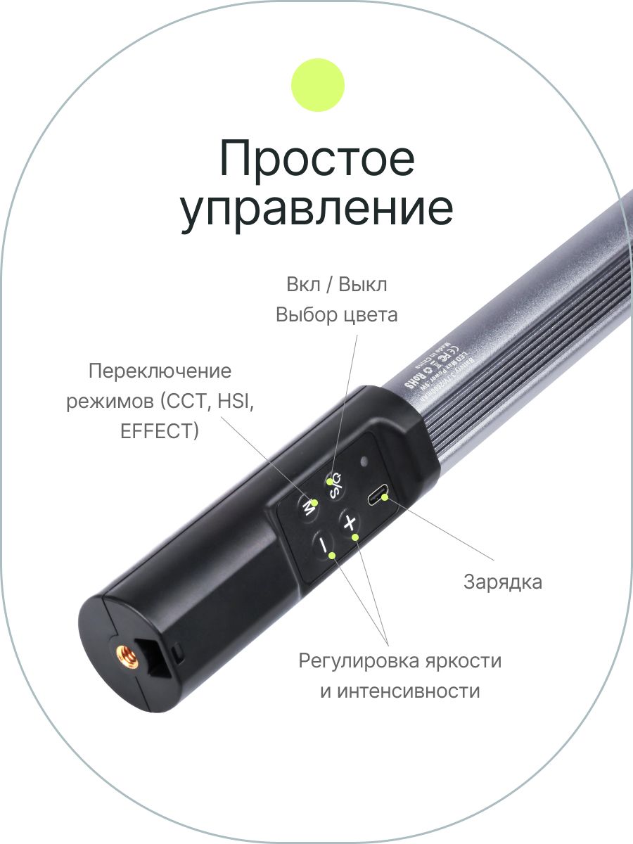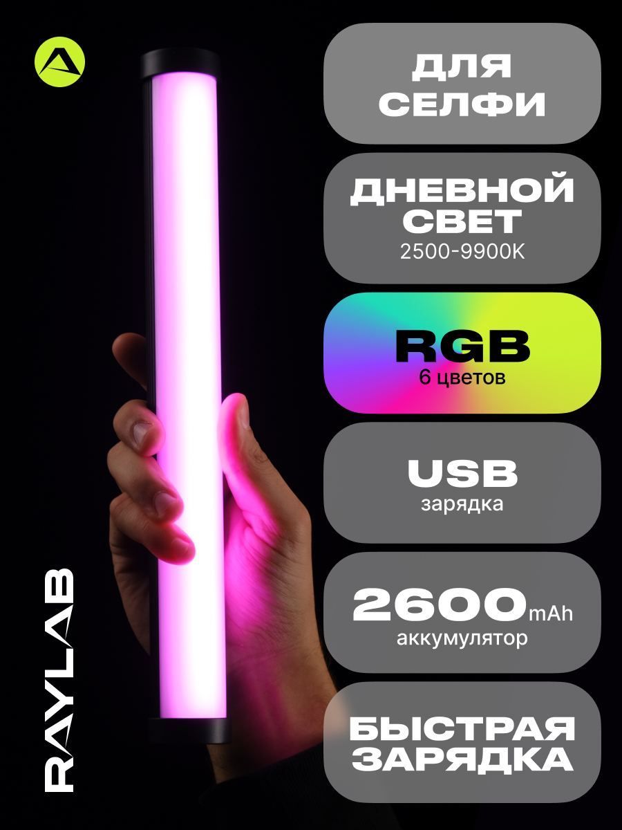 Описание: Raylab RL-LED09R - осветитель - световой жезл, который превратит ваши снимки и видео в настоящие произведения искусства. С его помощью вы сможете создавать захватывающие линейные блики, создавать остронаправленные тени и добавлять яркие цветовые акценты. Уникальный форм-фактор в виде трубки позволяет вам разместить его где угодно, будь то внутри автомобиля, бытовой техники или даже под одеждой. Независимо от места, вы сможете наслаждаться широким световым потоком и создавать потрясающие эффекты. С цветной лампой Raylab RL-LED09R вы можете выбирать между дневным светом с диапазоном цветовой температуры от 2500К до 9000К для создания естественного освещения, 6 самых популярных цветов для сосздания кпи света или различными световыми эффектами. Благодаря высокому индексу цветопередачи CRI>95, вы сможете передать цвета и оттенки объектов максимально точно и без искажений. Встроенный аккумулятор емкостью 2600мАч обеспечивает неоновой лампе до 8 часов непрерывной работы, что позволяет вам сосредоточиться на съемке, не беспокоясь о заряде. Установка осветителя на штатив или стойку становится легкой благодаря резьбовым креплениям 1⁄4"" на основании. А с встроенным магнитом, вы можете использовать светодиодный светитель как самостоятельный прибор, закрепив его на стальной поверхности, такой как труба или решетка. Неоновая лампа Raylab RL-LED09R обладает мощностью 9 Вт и осветит ваш объект с интенсивностью 1000 люксов на расстоянии 0.3м. С 12 стопами яркости от 1% до 100%, вы сможете точно настроить освещение в соответствии с вашими потребностями. Селфи лампа RL-LED09R компактная и легкая,поэтому будет надёжным помощников, который всегда с вами. Не упустите возможность приобрести Raylab RL-LED09R и открыть для себя новые грани творчества. Он поможет вам достичь невероятных результатов в качестве ваших снимков и видео, и станет незаменимым аксессуаром для каждого творческого проекта.