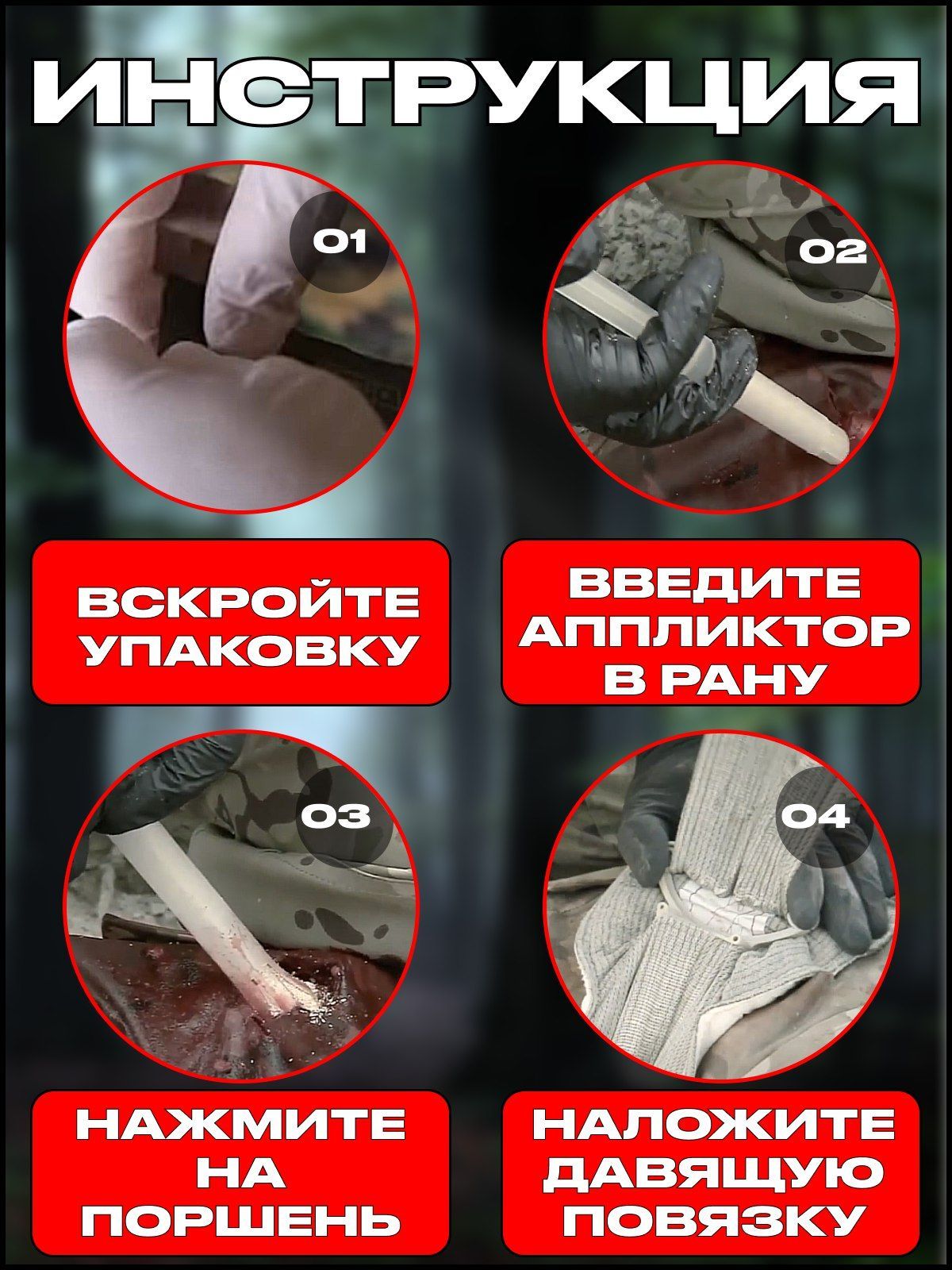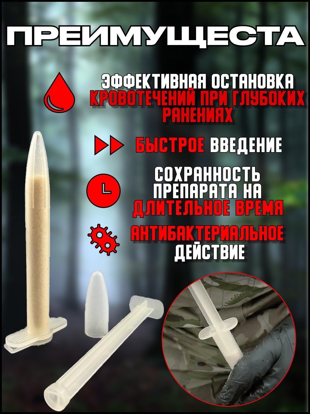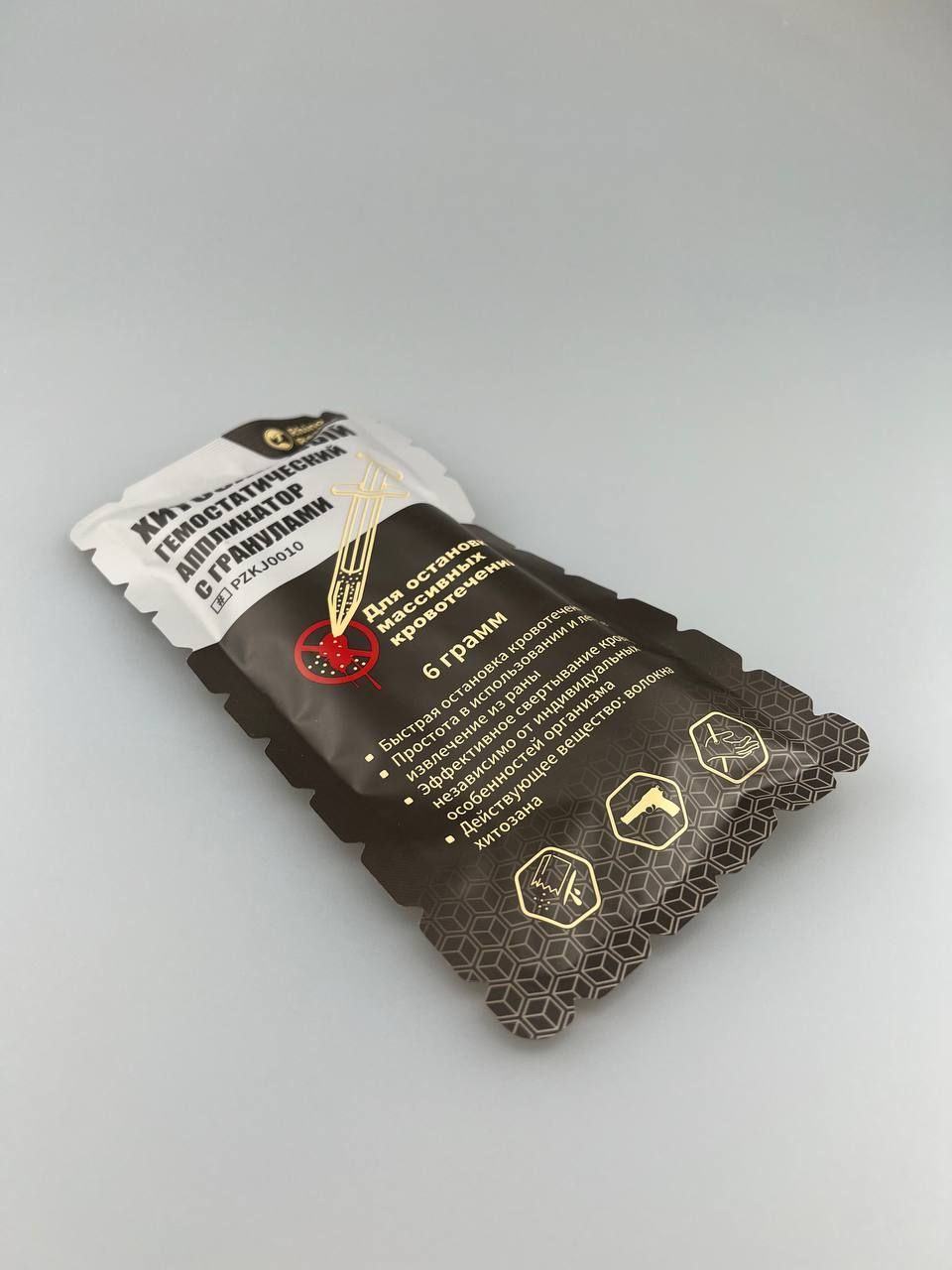 Инструкция по применению: медицинское изделие предназначено для остановки массивных поверхностных и внутренних кровотечений при ранениях. Введите устройство с гранулами прямо в рану. Для эффективной работы средство должно контактировать непосредственно с источником кровотечения.