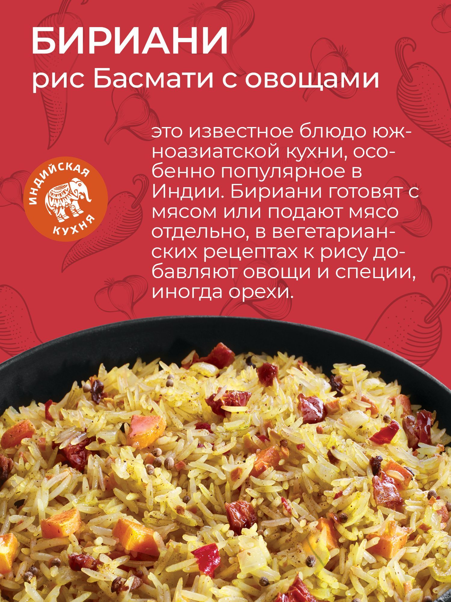 Описание: Бириани – ароматное и в меру острое блюдо южноазиатской кухни, которое имеет множество вариаций, но его основа – тонкий и ароматный рис Басмати – остается неизменной. Оно относится к традиционной южноазиатской кухне и пользуется огромной популярностью на территории Индии.