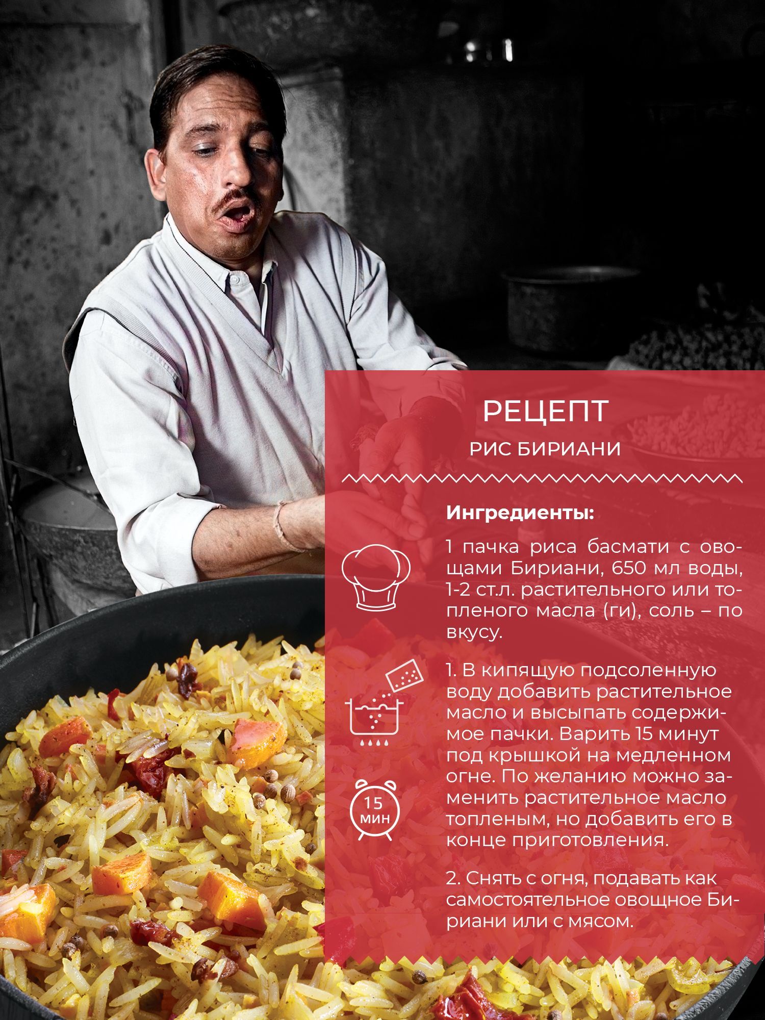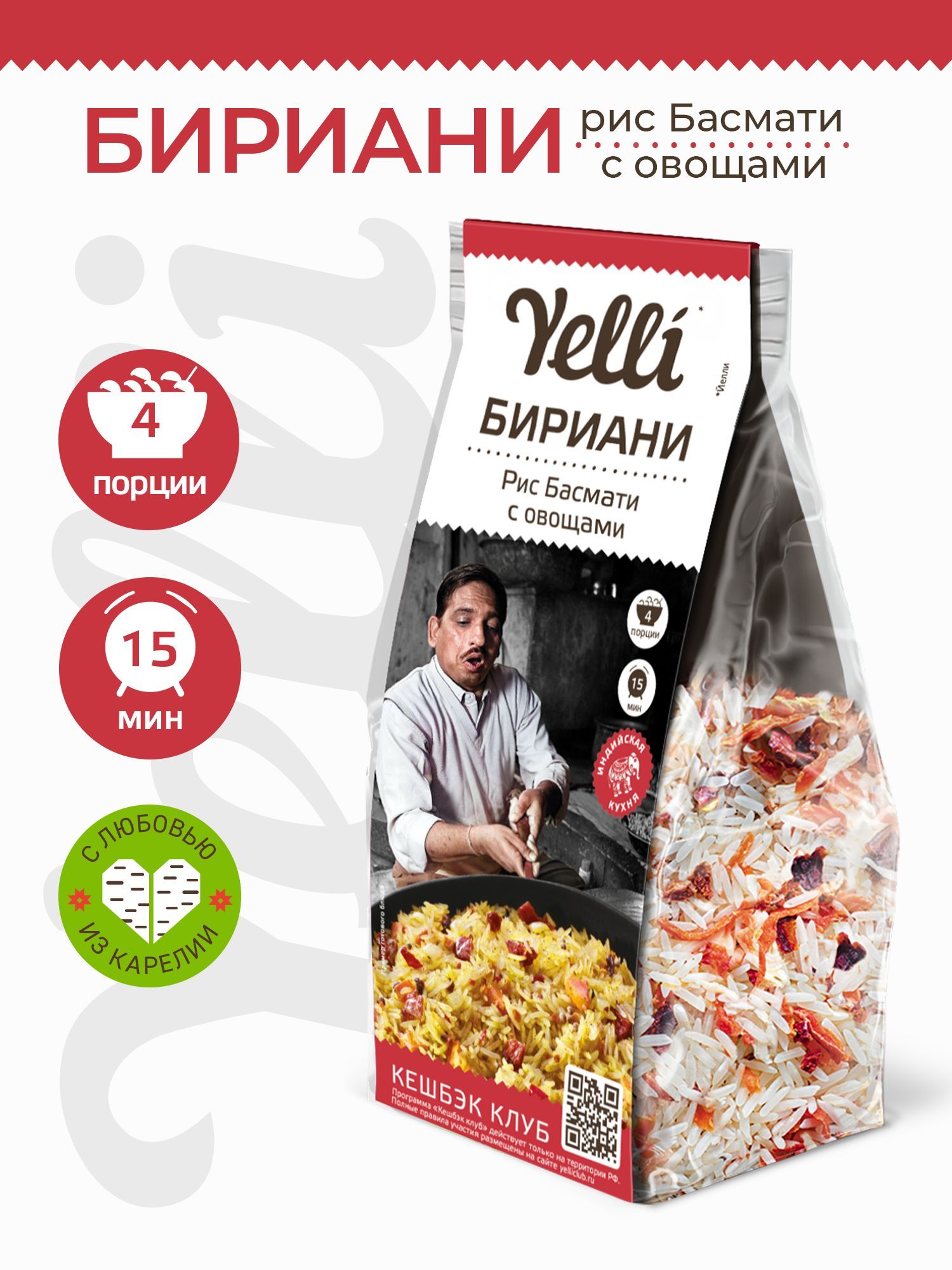 Бренд Yelli предлагает смесь для приготовления Бириани на основе Басмати с добавлением сушеных овощей: моркови, паприки, лука, томатов и чеснока, молотых пряных специй, среди которых куркума, перец чили и кориандр. Она позволит легко и быстро приготовить вкусный гарнир или полноценное самостоятельное блюдо. На 1 пачку потребуется 650 мл воды, растительное или топленое масло и соль. В кастрюлю с кипящей подсоленной водой нужно добавить растительное масло, высыпать содержимое пакета, после закипания варить под крышкой на медленном огне 15 минут. При использовании не растительного, а топленого масла, его добавляют в конце варки. В вегетарианских рецептах добавляются овощи и специи,иногда орехи. Также можно приготовить блюдо с мясом или подать мясо отдельно, с курицей и даже с креветками. Басмати отлично сочетается с соусами. Бириани – универсальное блюдо, которое можно подать на обед или ужин и даже на праздничный стол. Не составит труда приготовить его и на домашней кухне, и в туристическом походе вместо вредных полуфабрикатов. Сухие овощи и рис содержат пищевые волокна, которые нормализуют работу кишечника. Кроме того, смесь богата витаминами и микроэлементами. Смесь от бренда Yelli является 100% натуральным продуктом, в его составе нет ГМО, соли и искусственных добавок. Она гармонично дополнит вегетарианское, веганское, постное, диетическое меню и станет находкой для тех, кто придерживается правильного питания (ПП), следит за своей фигурой и стремится к сохранению стройности. Рис Басмати со смесью овощей обладает массой полезных свойств и изысканным вкусом и станет прекрасным подарочным вариантом.