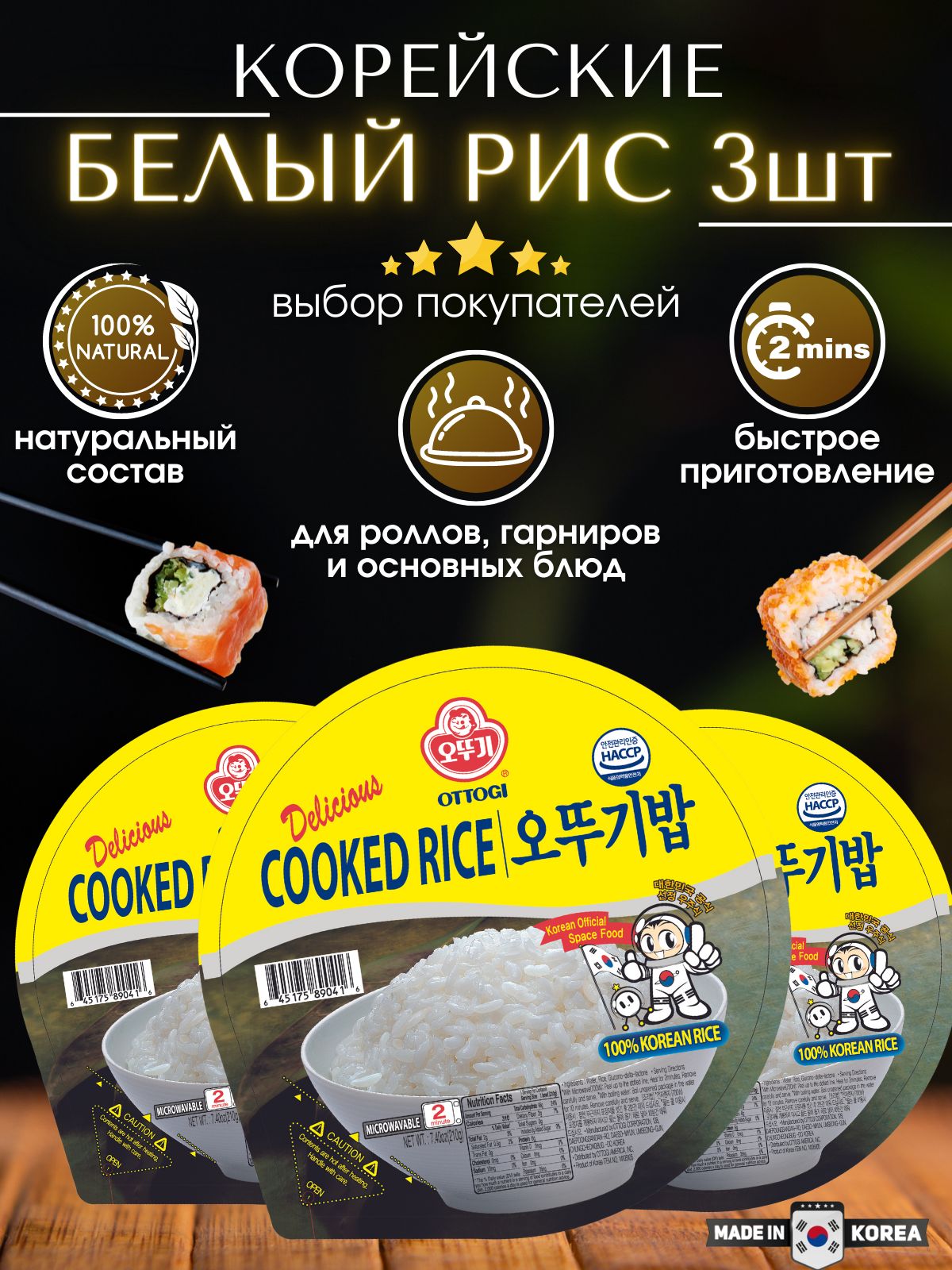 Описание: Текст при отключенной в браузере загрузке изображенийКорейский готовый отварной рис сэкономит Ваше время, потраченное на готовку, и избавит от необходимости мыть грязную посуду. Также, как и рис басмати, рис жасмин, бурый рис, дикий рис, черный рис, рис круглозерный и пропаренный Вы можете использовать готовый рис Оттоги для приготовления суши и роллов, для плова, а так в качестве гарнира или основного блюда. Готовый отварной рис от торговой марки Ottogi – это отличное решение для тех, кто часто обедает вне дома. Он сварен в соответствии с традициями корейской кухни, имеет приятный вкус и тонкий аромат. Это блюдо очень сытное, и одной порции будет достаточно, чтобы много часов сохранять высокую работоспособность, не испытывая чувства голода. В упаковке 3 штуки. Для насыщенности вкуса рекомендуется добавить соевый соус.
