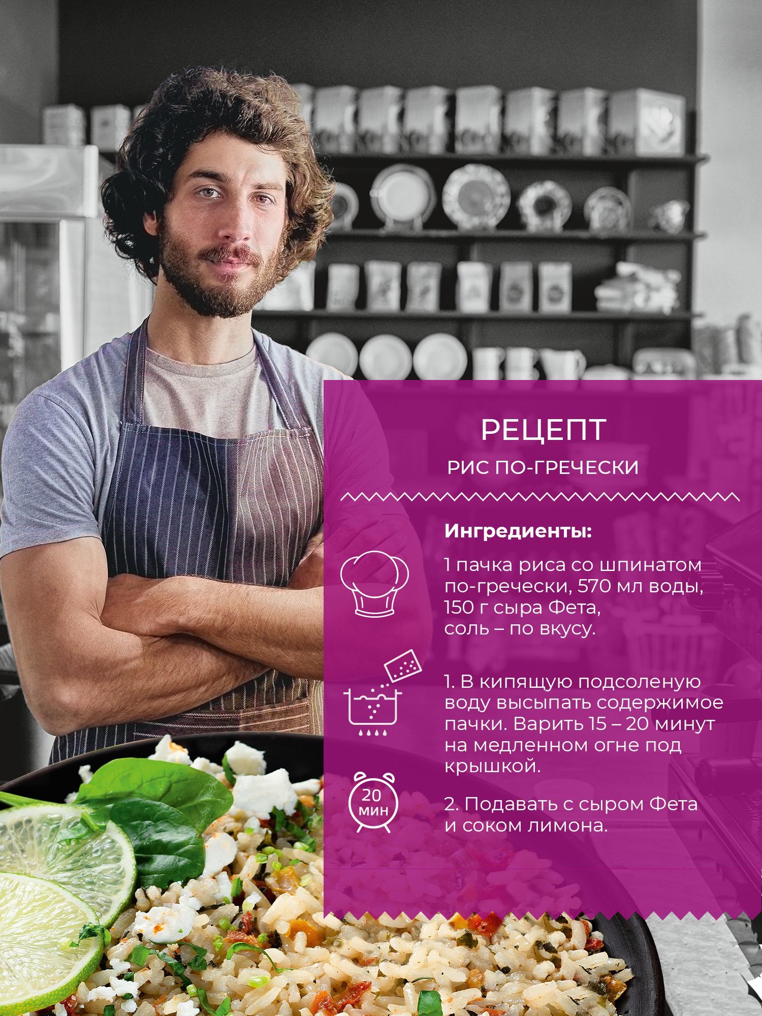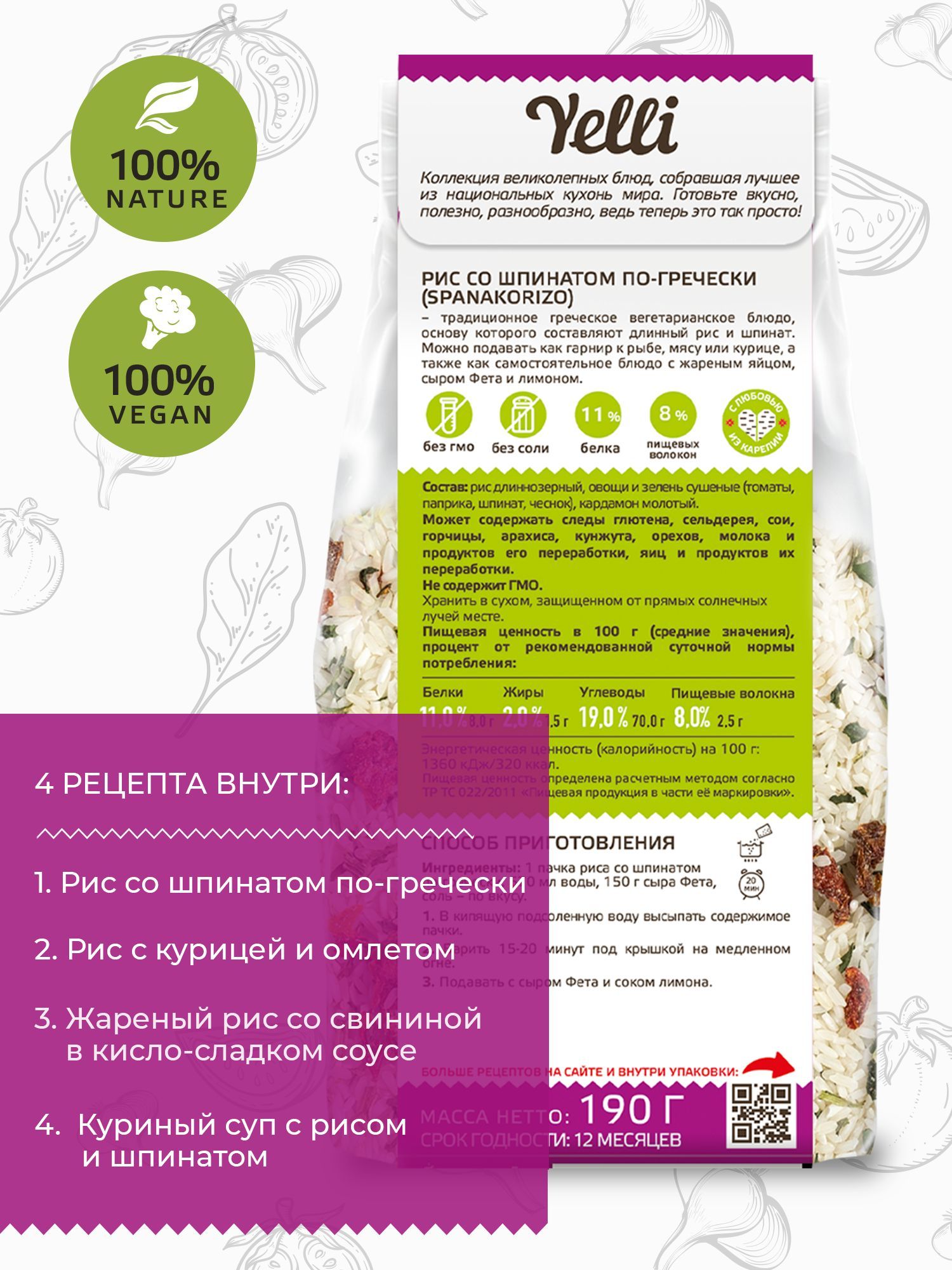 Рис со шпинатом по-гречески от бренда Yelli по достоинству оценят даже истинные гурманы. Продукт является 100% натуральным, не содержит ГМО и соли, подходит для вегетарианцев и веганов, а также тех, кто предпочитает сбалансированное правильное питание (ПП). Процесс его приготовления занимает всего 20 минут, осуществляется быстро и легко. Достаточно просто залить в кастрюлю 570 мл воды, подсолить и довести до кипения, высыпать содержимое пачки, варить на медленном огне под крышкой в течение 15-20 минут. Рис со шпинатом можно подать в качестве полезного завтрака или второго обеденного блюда. Продукция отличается тщательно подобранным составом. В ней содержится рис, смесь сушеных овощей и зелени, включая помидоры, паприку, шпинат и чеснок, а также молотый кардамон. Она является универсальной, идеально дополнит как диетическое и постное меню, так и рацион любителей более сытных блюд, ведь эту смесь можно приготовить с мясом, курицей, креветками. Блюдо легко приготовить как на домашней кухне, так и на даче и в туристическом походе. Продукт станет отличной подарочной идеей для людей, которые ведут здоровый образ жизни и следят за своим питанием.