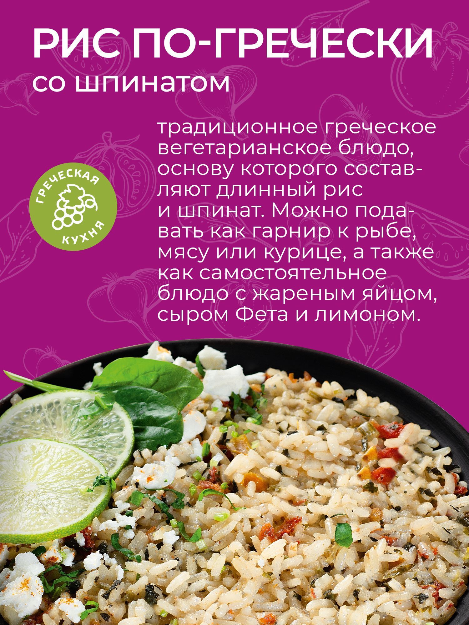 Описание: Рис по-гречески – традиционное вегетарианское блюдо, основу которого составляют длинный рис и шпинат. Можно подавать как гарнир к рыбе, мясу или курице, а также как самостоятельное блюдо с жареным яйцом, сыром Фета и лимоном.