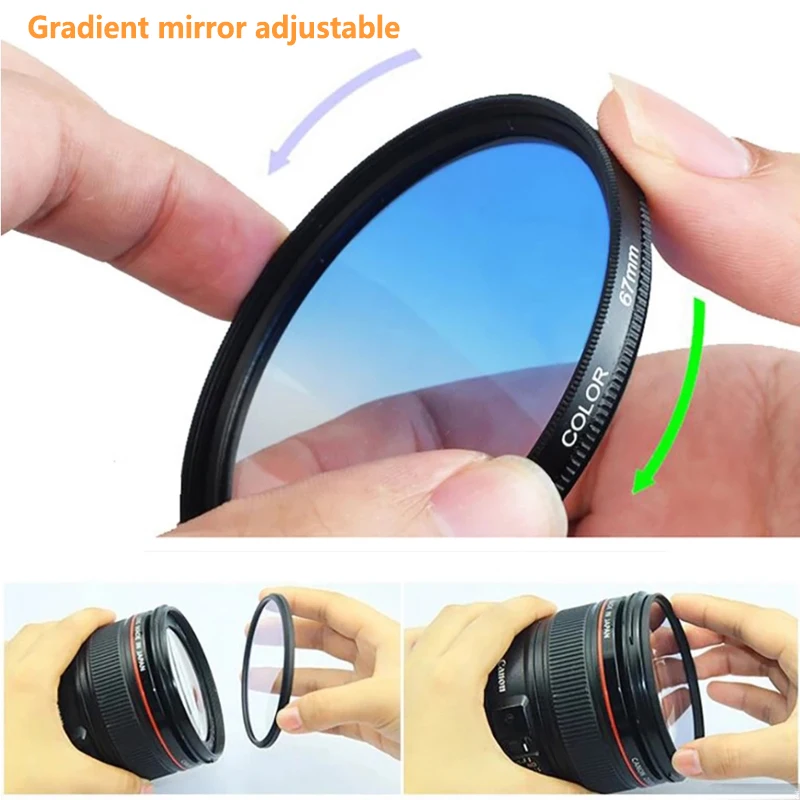Этот фильтр имеет двойную резьбу, что позволяет навинчивать друг на друга дополнительные фильтры. Использование двух цветных градуированных фильтров, повернутых 180 градусы относительно друг друга, позволяет разным цветам переодеваться друг в друга.