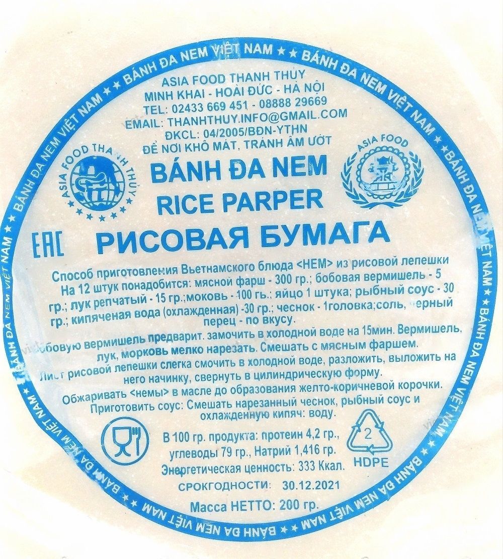 Описание: Рисовая бумага - это продукт, который обязательно полюбится ценителям восточной кухни. Рисовая бумага напоминает русский блинчик, в который заворачивают начинку. Но вместе с тем это тонкое полупрозрачное тесто, состоящее всего лишь из риса и воды. Этот уникальный диетический продукт не содержит жиров и сахара. Издавна в восточной кухне популярность рисовой бумаги не ослабевает: во Вьетнаме ее используют для приготовления вкуснейших традиционных блинчиков Нэм, в Китае делают спринг роллы с овощной начинкой, в Японии – горячие роллы с морепродуктами. Для того чтобы придать эластичность рисовой бумаге, достаточно смочить ее водой, затем можно наполнять любой начинкой. Рисовую бумагу употребляют холодной и горячей, обжаренной или сырой.