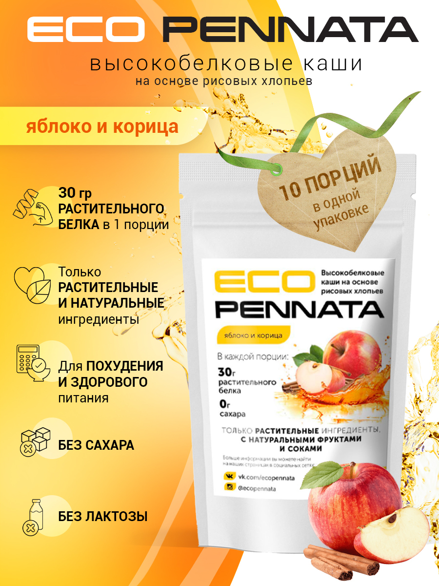 EcoPennata – это натуральные каши в состав которых входят сушенные яблоки без сахара, растительный рисовый протеин обогащённый аминокислотами, пребиотическая пищевая клетчатка и натуральные сублимированные соки.