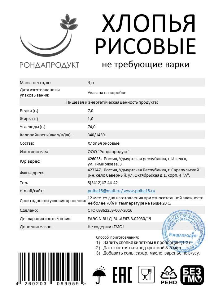 Рисовые хлопья, не требующие варки 4,5 кг, БЕЗ ГЛЮТЕНА, каша быстрого приготовления, постные, весовые Рондапродукт