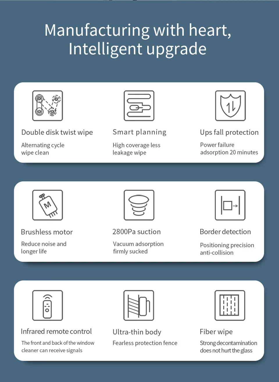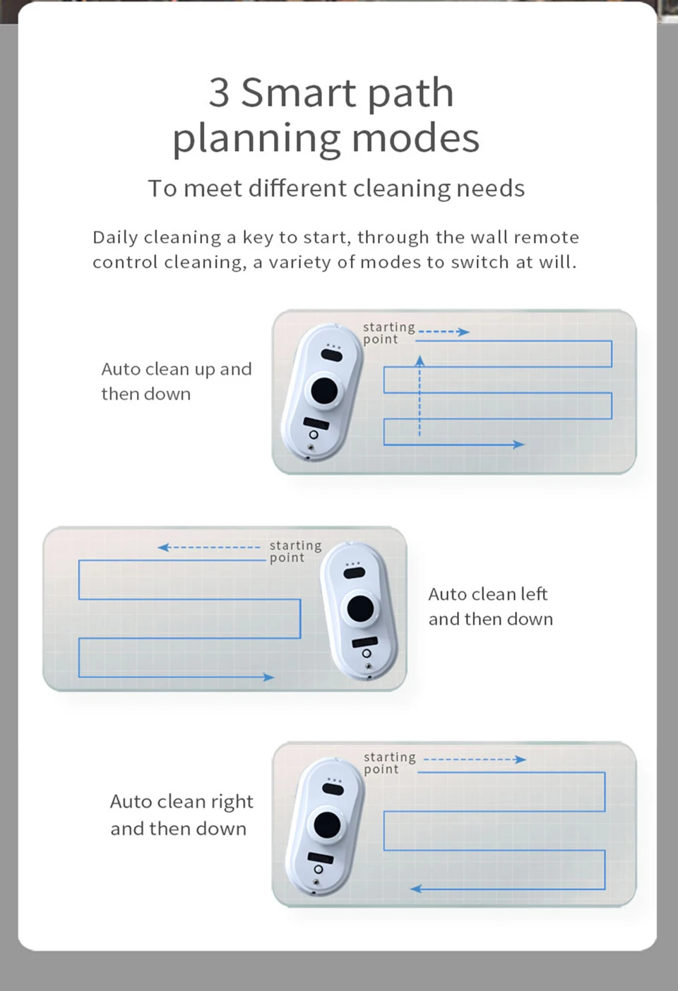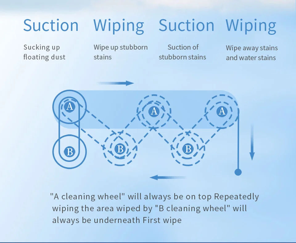 1. Подождите 20 секунд после запуска, пока синий свет не перестанет мигать, а затем начните работать. Потому что роботу нужно 20 секунд, чтобы обнаружить стеклянную плоскость.