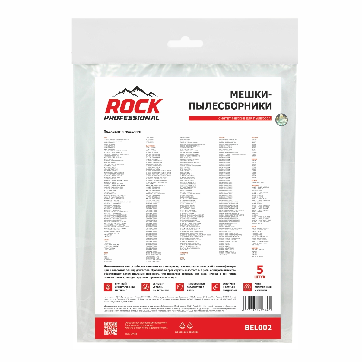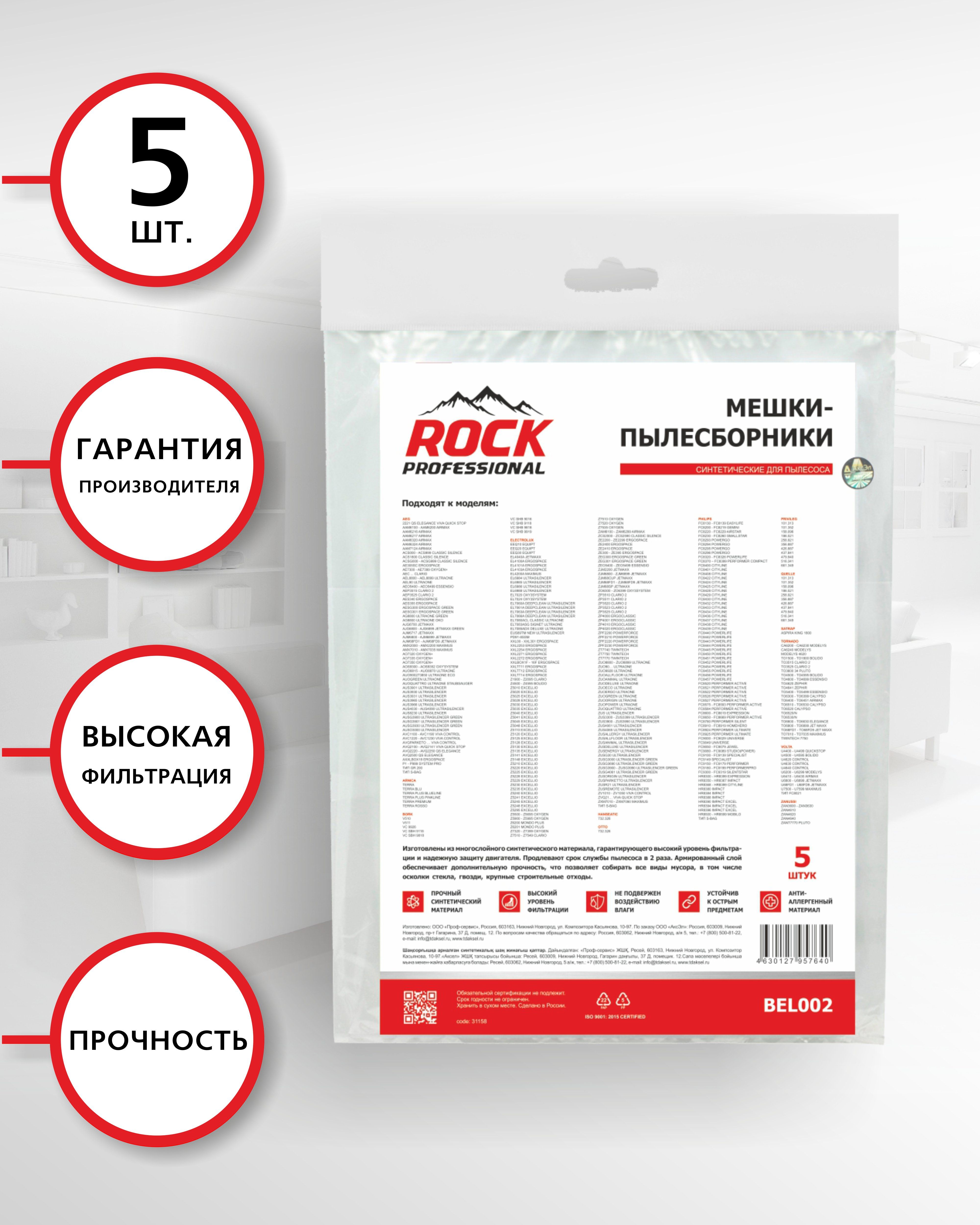 ROCK PROFESSIONAL BEL002 Мешки пылесборники для пылесоса ELECTROLUX 5 шт, синтетические многослойные, подходят: AEG PHILIPS TORNADO VOLTA ZANUSSI