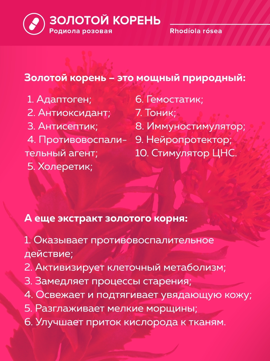 Сегодня родиола розовая используется преимущественно в виде пищевой добавки, обладающей внушительным количеством полезных свойств. Рассмотрим их детально.