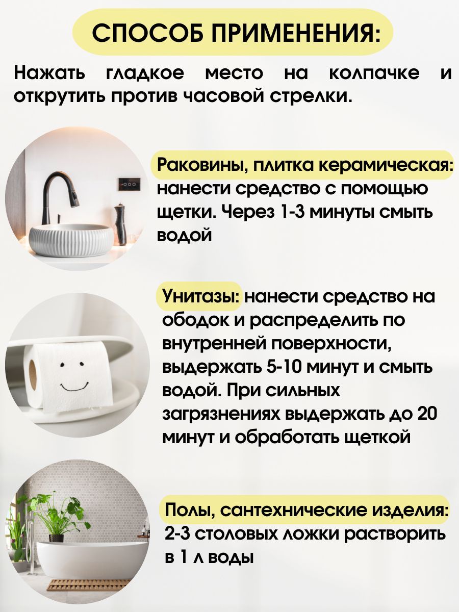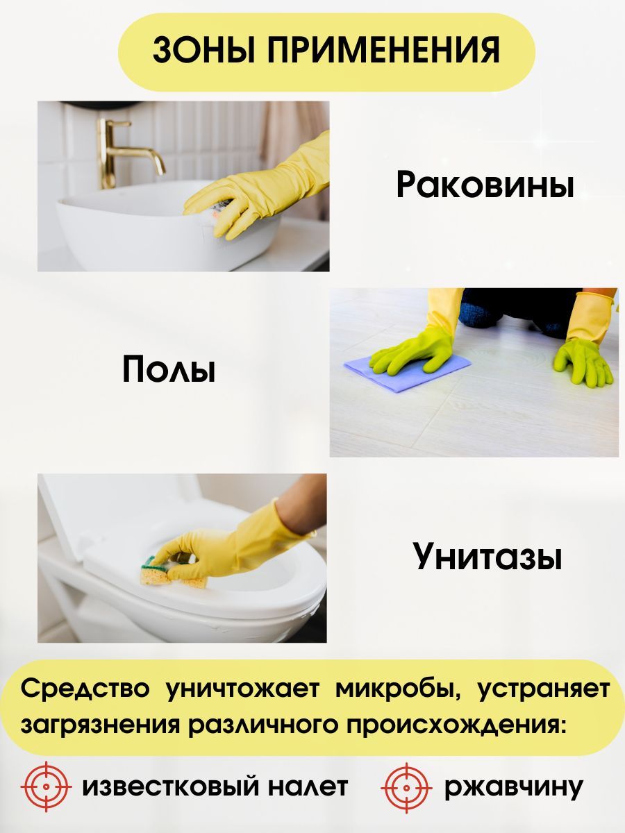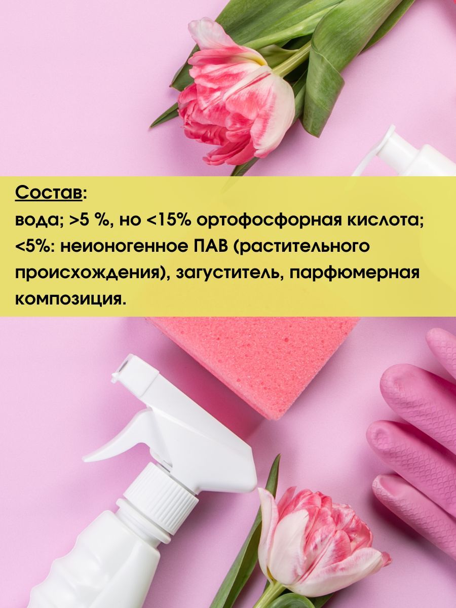 Эффективно справляется с загрязнениями Придает поверхности естественный блеск Не оставляет разводовОптимальный баланс эффективности и безопасности средства для унитаза достигается за счёт применения лимонной кислоты. Благодаря своим природным свойствам, эта органическая кислота отлично справляется с загрязнениями, не повреждая при этом эмаль. Придает чистоту и блеск сантехнике, а также устраняет сам налет, источники неприятного запаха и не оставляет после себя никаких следов, только свежесть - полный комплект и дезинфекция для микробов и бактерий, возбудителей любых кишечных инфекций, убивает вирусы.