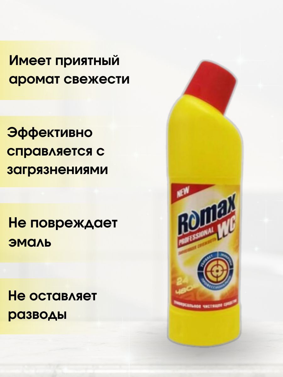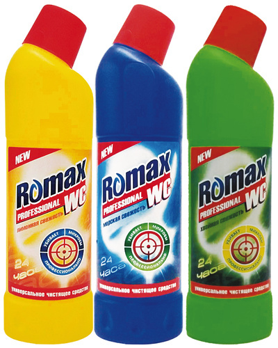 Предназначено для мытья стекол и зеркал от жировых налетов и грязевых налетов, жировых отложений, отпечатков пальцев Средство чистящее универсальное Romax WC предназначено для чистки сантехнических изделий (ванн, раковин, унитазов), различных фаянсовых изделий и кафеля от ржавчины, известковых отложений, органических и жировых загрязнений, а также удаления неприятных запахов.