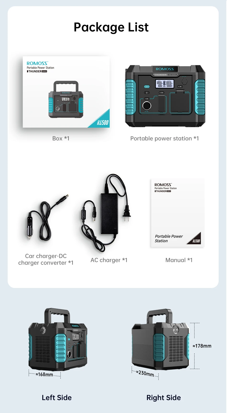 Outputs 500W AC Outlet | 3*USB (18W MAX) | Type C (60W MAX) | Car Charge ( 120W MAX)