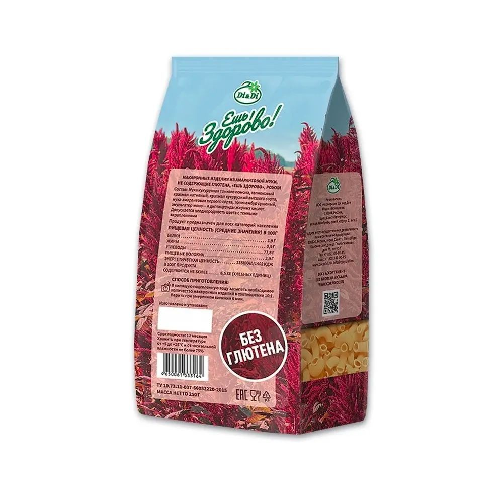 Описание: Макаронные изделия Рожки БЕЗ ГЛЮТЕНА производятся по уникальному рецепту из кукурузной и амарантовой муки, с добавлением топинамбура. Высокое содержание аминокислот, кальция, волокон и растительного белка, делают макароны «Ешь ЗдорОво» незаменимым помощником при соблюдении диеты. Идеально сочетаются с томатным соусом и соусом песто.