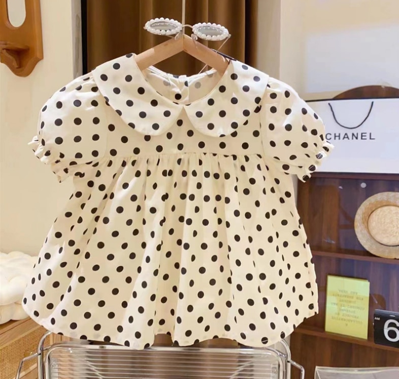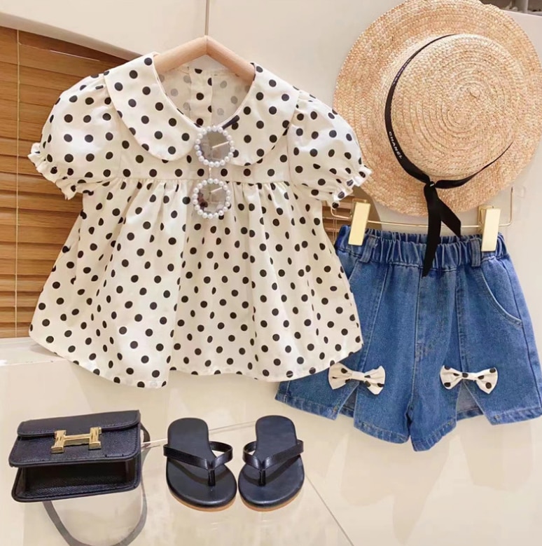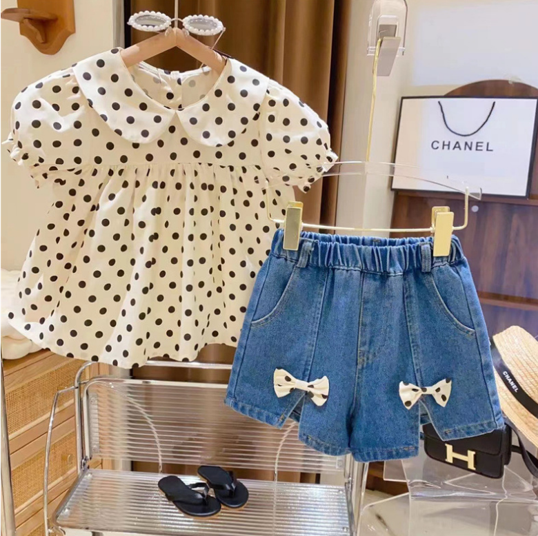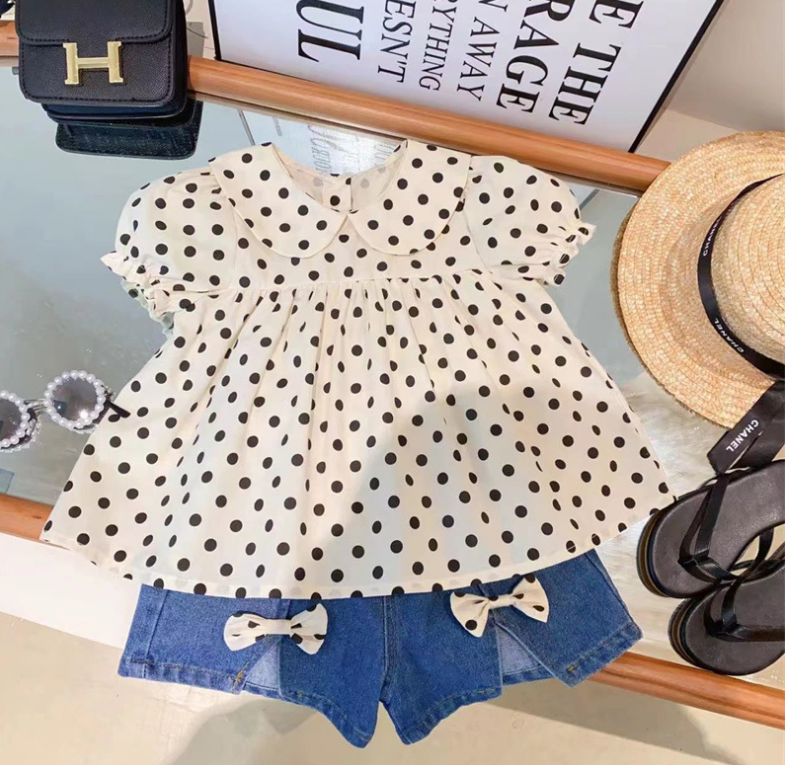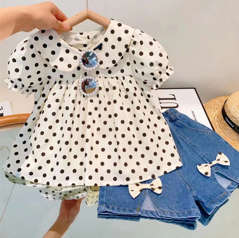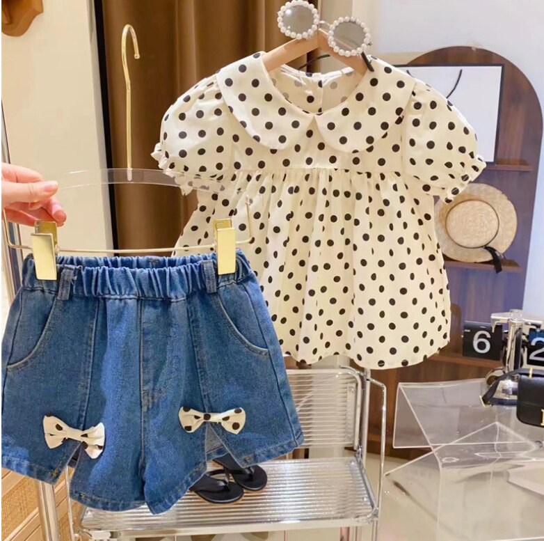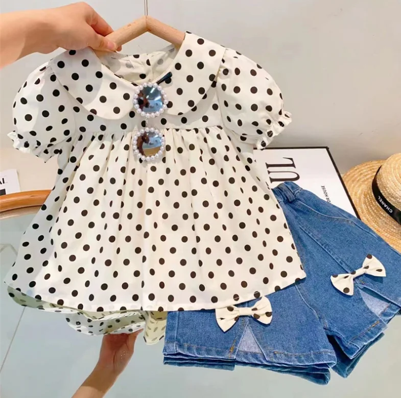 Розничная продажа, новинка 2023, милые летние комплекты для маленьких девочек, топ в горошек + джинсовые шорты, искусственная принцесса