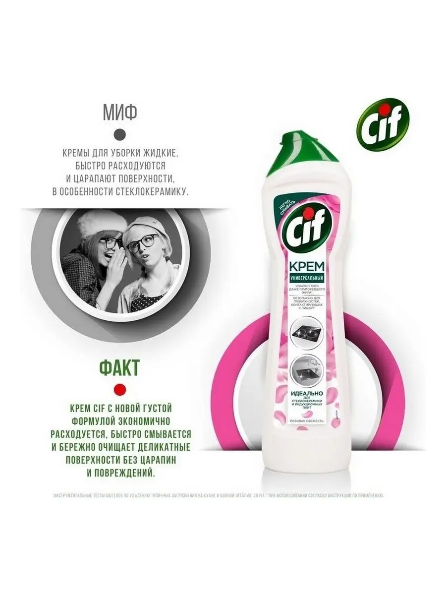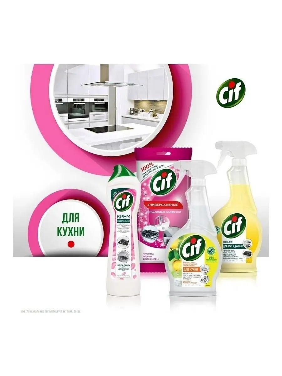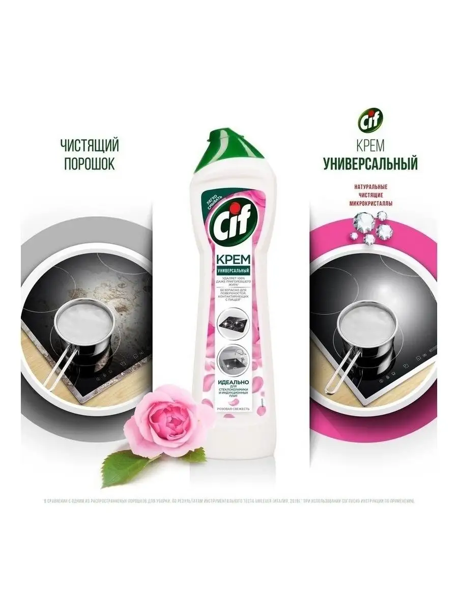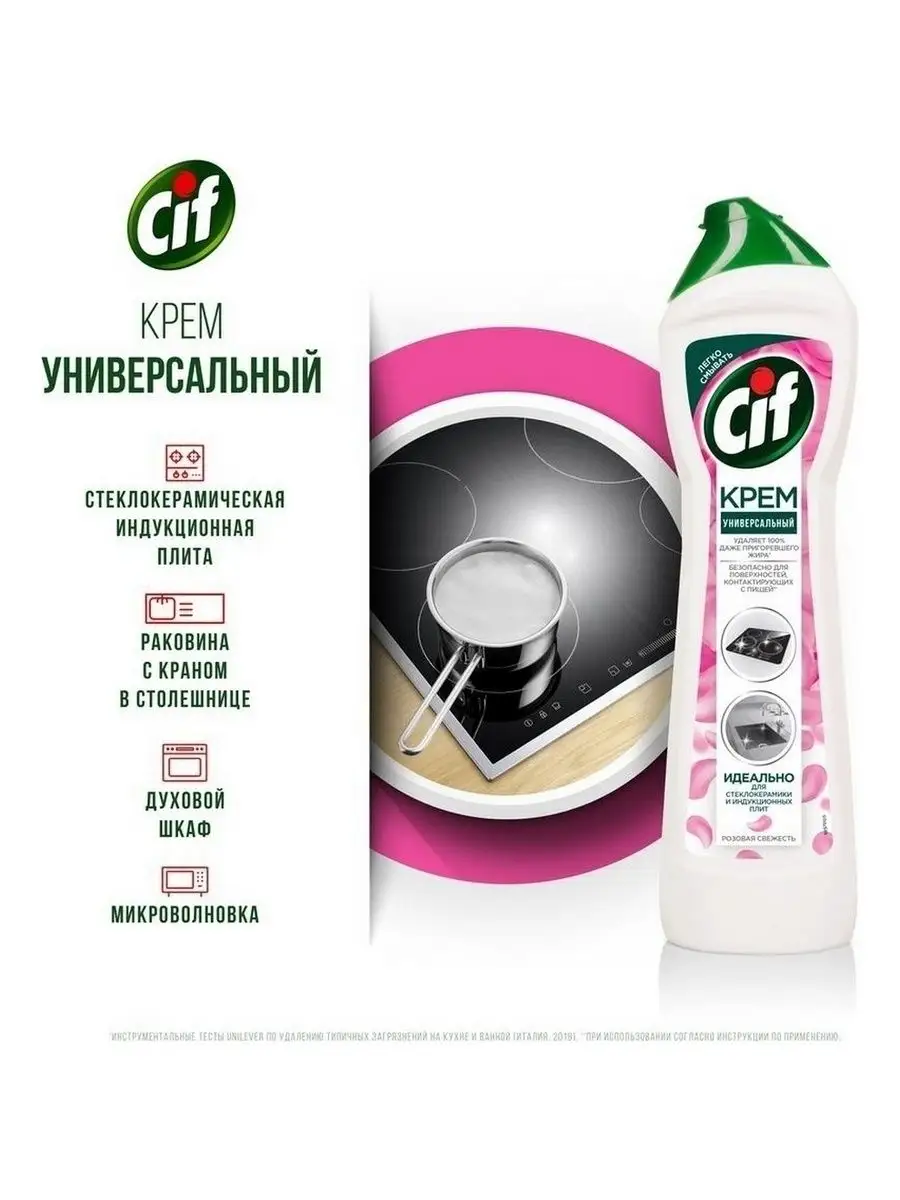 Описание: Как выбрать моющее средство для кухни? Ведь необходимо качественно удалить жирные пятна и нагар и при этом обеспечить безопасность поверхностей, контактирующих с едой. Решение есть: новинка Cif - чистящий крем Розовая свежесть для кухни.Обновленная формула легко побеждает жир, остатки еды и масляные пятна*. Благодаря кремовой текстуре и чистящим микрокристаллам средство Cif проникает внутрь загрязнений, расщепляет их и бережно удаляет, не повреждая** даже деликатные поверхности, как стеклокерамика. Крем подходит для чистки варочной поверхности, духовки, микроволновки, столешницы и мойки.Чистящий крем Cif - это сочетание нежной кремовой текстуры для глубокого проникновения внутрь пятен и активных микрокристаллов для их удаления. Cif эффективно борется с загрязнениями и оставляет легкий цветочный ароматCif - дом снова красив!*Инструментальные тесты Unilever по удалению типичных загрязнений на кухне и ванной (Италия, 2019)**Инструментальные тесты Unilever (Италия, Россия, 2018-2020)