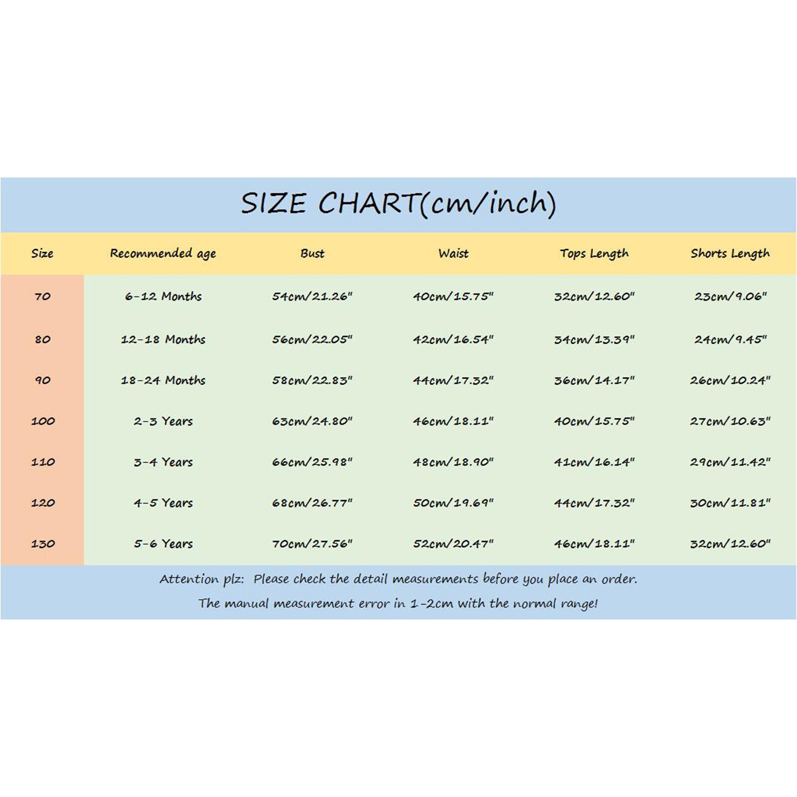 Размер: 70 Рекомендуемый Возраст: 6-12 месяцев Бюст: 54 см/21,26 дюйма Талия: 40 см/15,75 дюйма Длина топа: 32 см/12,60 дюйма Длина Шорт: 23 см/9,06 дюйма