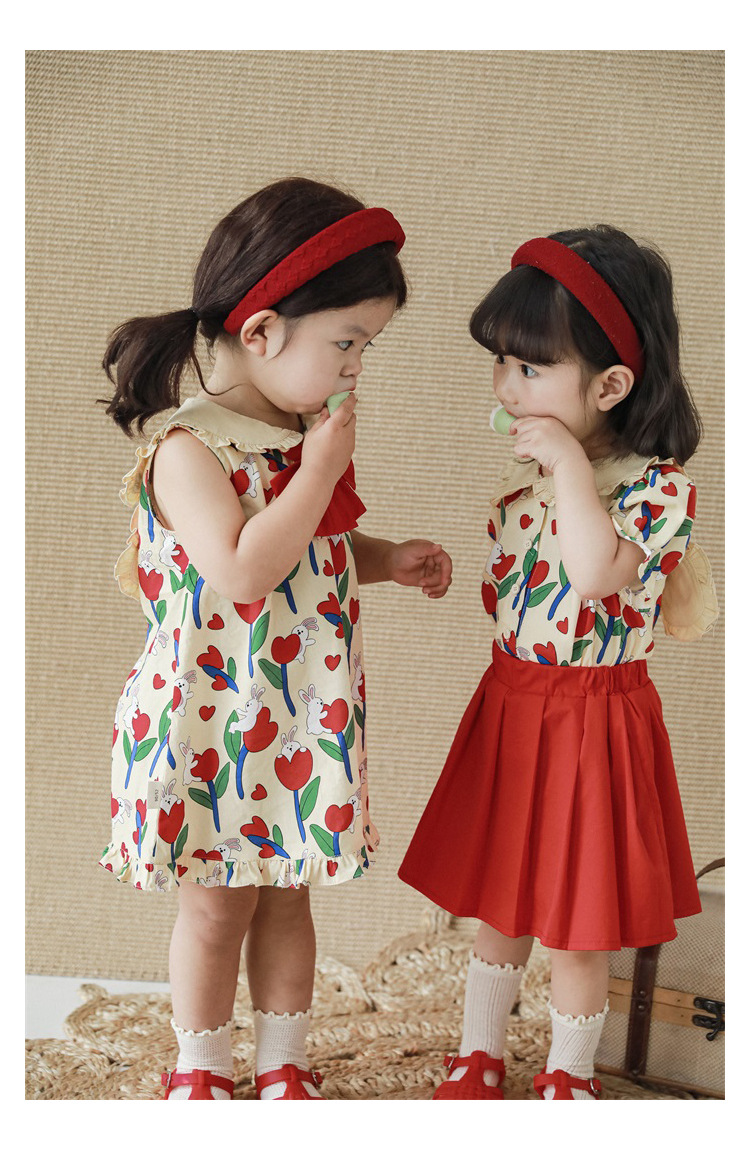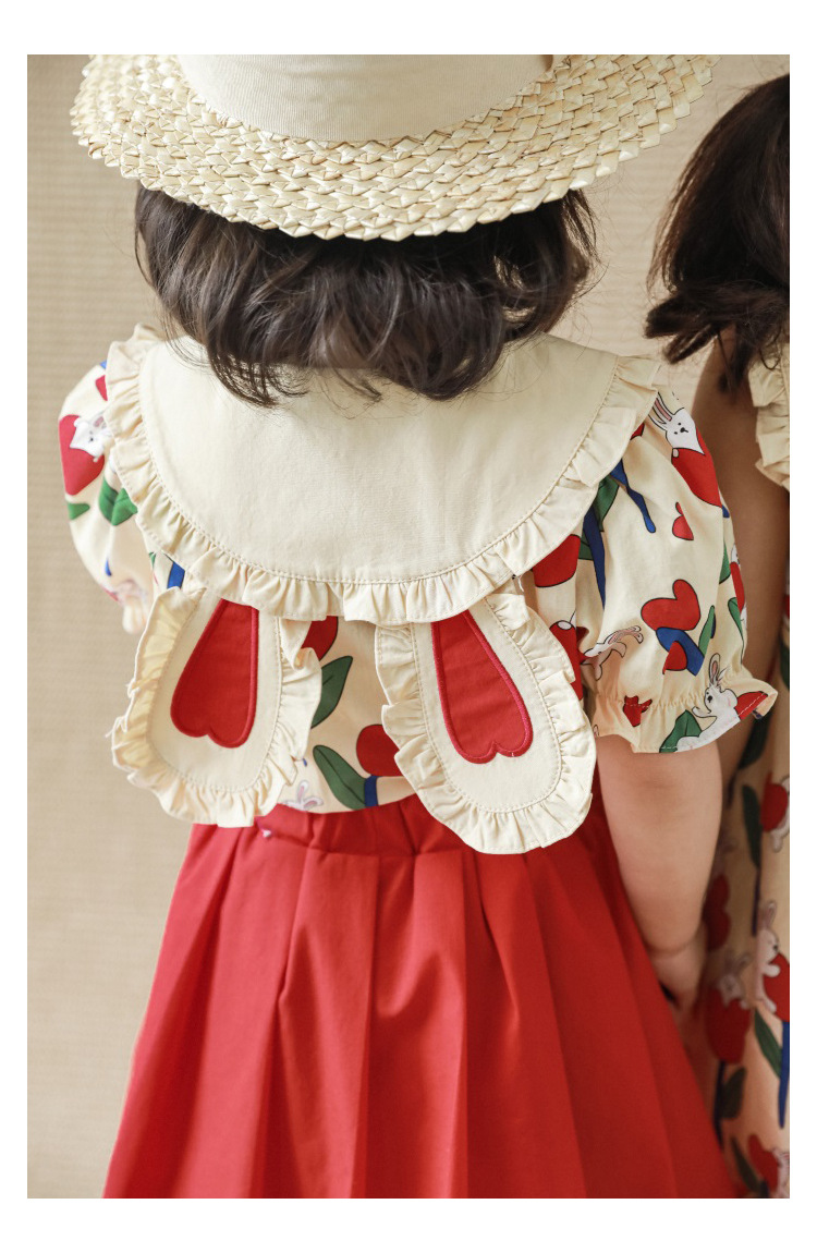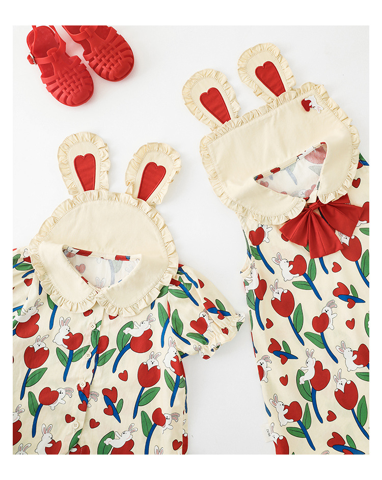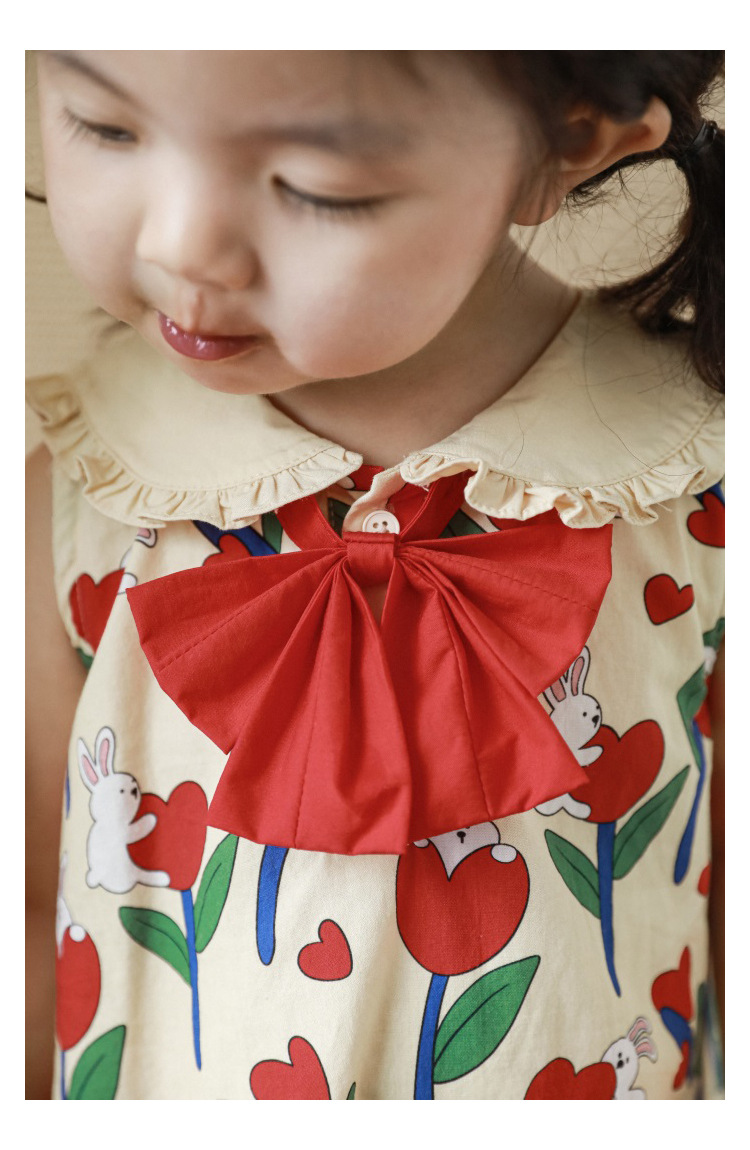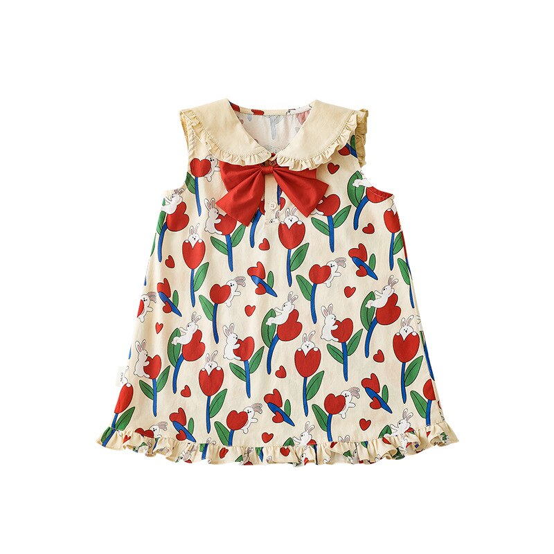 Рубашка-юбка с отложным воротником и мультяшным принтом для девочек, новинка 2023, детское летнее платье в пасторальном стиле для малышей из чистого хлопка с удобным принтом и бантом и цветами