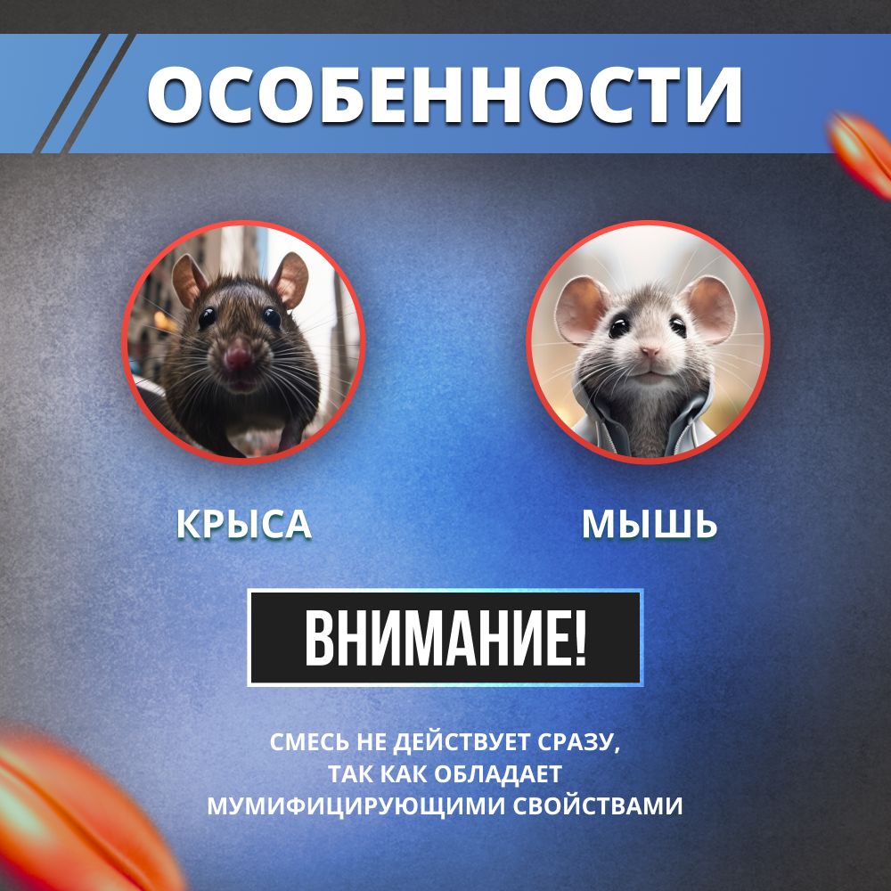Описание: Вы хотите избавиться от грызунов на вашей даче или в доме? Устали от бесконечной борьбы с назойливыми крысами и мышами? Предлагаем вам средство, которое навсегда решит вашу проблему - Зерна Rubit, мумифицирующая отрава от мышей и крыс. Зерновая приманка - это уникальное средство, разработанное специально для эффективной борьбы с грызунами. Оно обеспечивает надежную защиту от вредителей, не оставляя им ни единого шанса на выживание. Благодаря мощному действию препарата, мыши и крысы погибают в течение 2-6 суток после контакта с отравой. Одной из главных особенностей Рубит зерен является ее универсальность. Она подходит для использования как на даче, так и в доме. Благодаря специальной форме и упаковке, вы можете расположить отраву в любом удобном для вас месте. Наше средство доступно в виде гранул, а также зерен и брикетов , что позволяет выбрать наиболее удобной способ применения. Наши зерна вызывают свертываемость крови у крыс и мышей, а также приступы удушья, что и делает мумификация. Важно отметить, что отрава Рубит абсолютно безопасна для домашних животных. Благодаря гуманному подходу к борьбе с вредителями, отрава не представляет опасности для домашних питомцев. Так как сильно зависит от размера вредителя. При наличии домашних питомцев, помещайте зерна в труднодоступные места, контейнеры, коробочки. Истребитель Рубит - это не просто отрава от черных и серых крыс, это полноценное решение вашей проблемы. Она эффективно работает даже в самых сложных условиях, обеспечивая полное уничтожение грызунов и предотвращая их повторное появление.