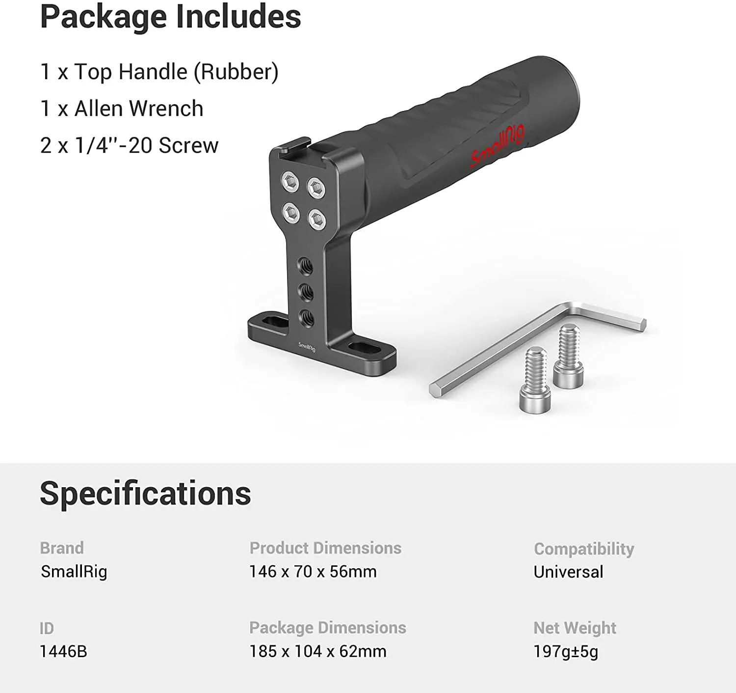 Верхняя ручка SmallRig 1446 может быть установлена на верхнюю пластину клетки с помощью двух винтов 1/4 ". Это обеспечивает много удобства при выполнении ручной съемки. Резиновая ручка хорошего качества очень хорошо выглядит, а специальная конструкция увеличивает трение во время ручной съемки. Он оснащен холодной обувью сверху для крепления микрофона и других аксессуаров.