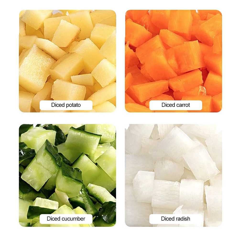 Примечание: При использовании этого картофельного резака, пожалуйста, нарежьте картофель или фрукты и овощи на мелкие кусочки, с планкой вниз, и нажмите равномерно при нажатии, а не с взрывной силой. Чрезмерная сила может легко повредить лезвие. Более твердые ингредиенты следует варить на пару или варить около трех минут.