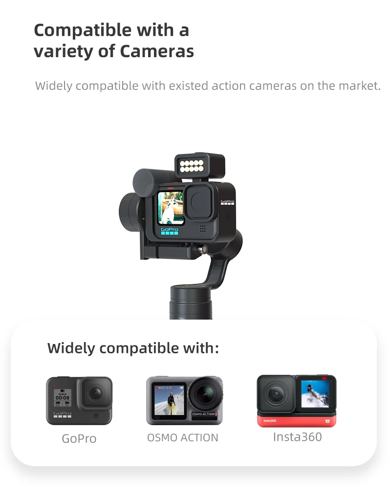 Стабилизатор карданного подвеса для экшн-камеры: совместим с GoPro Hero 9/8/7/6/5, OSMO Action и другими большинством экшн-камер, грузоподъемность 200 г, и легко собирать и разбирать с помощью оригинального винта, больше не беспокоясь о размере камеры.